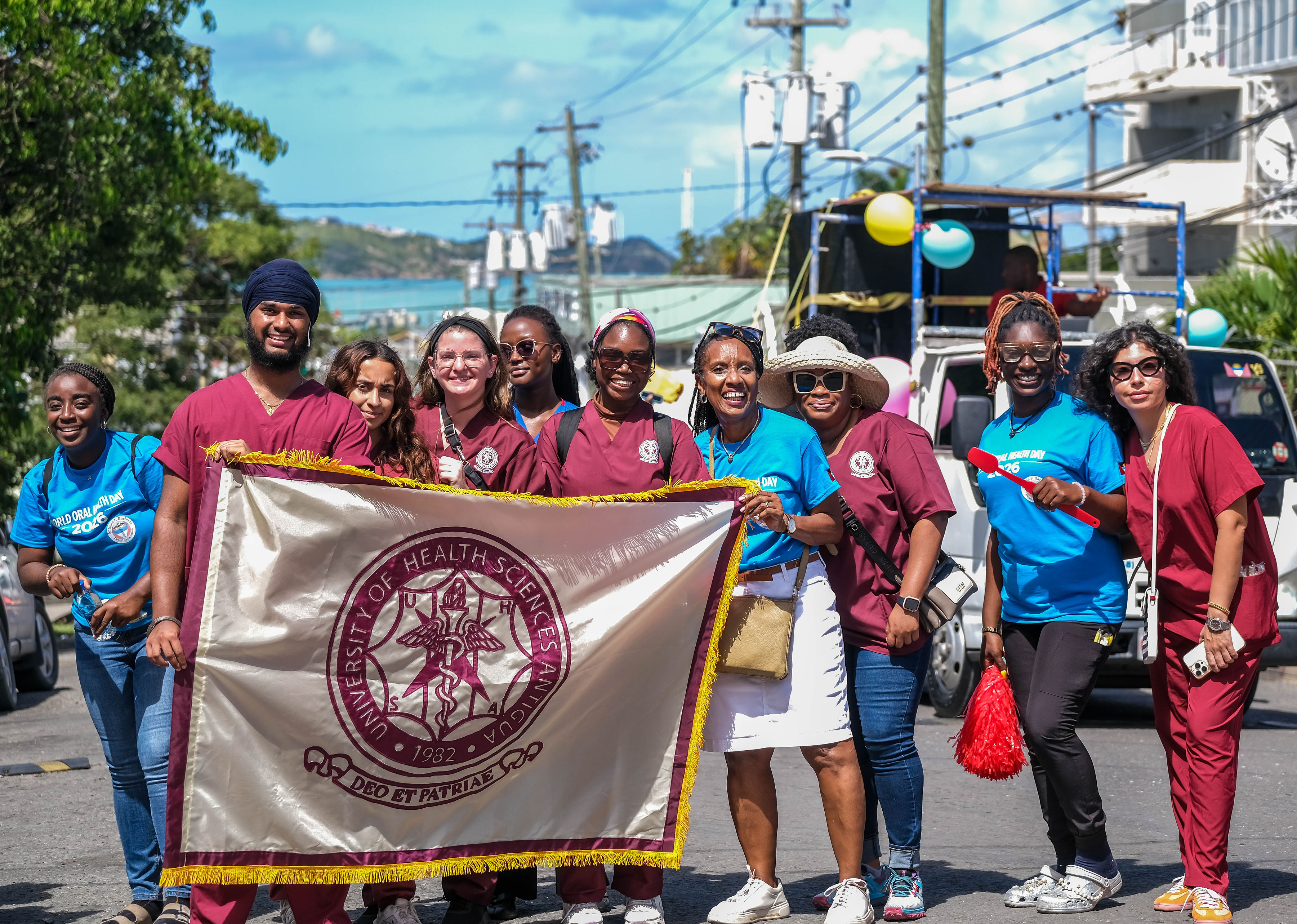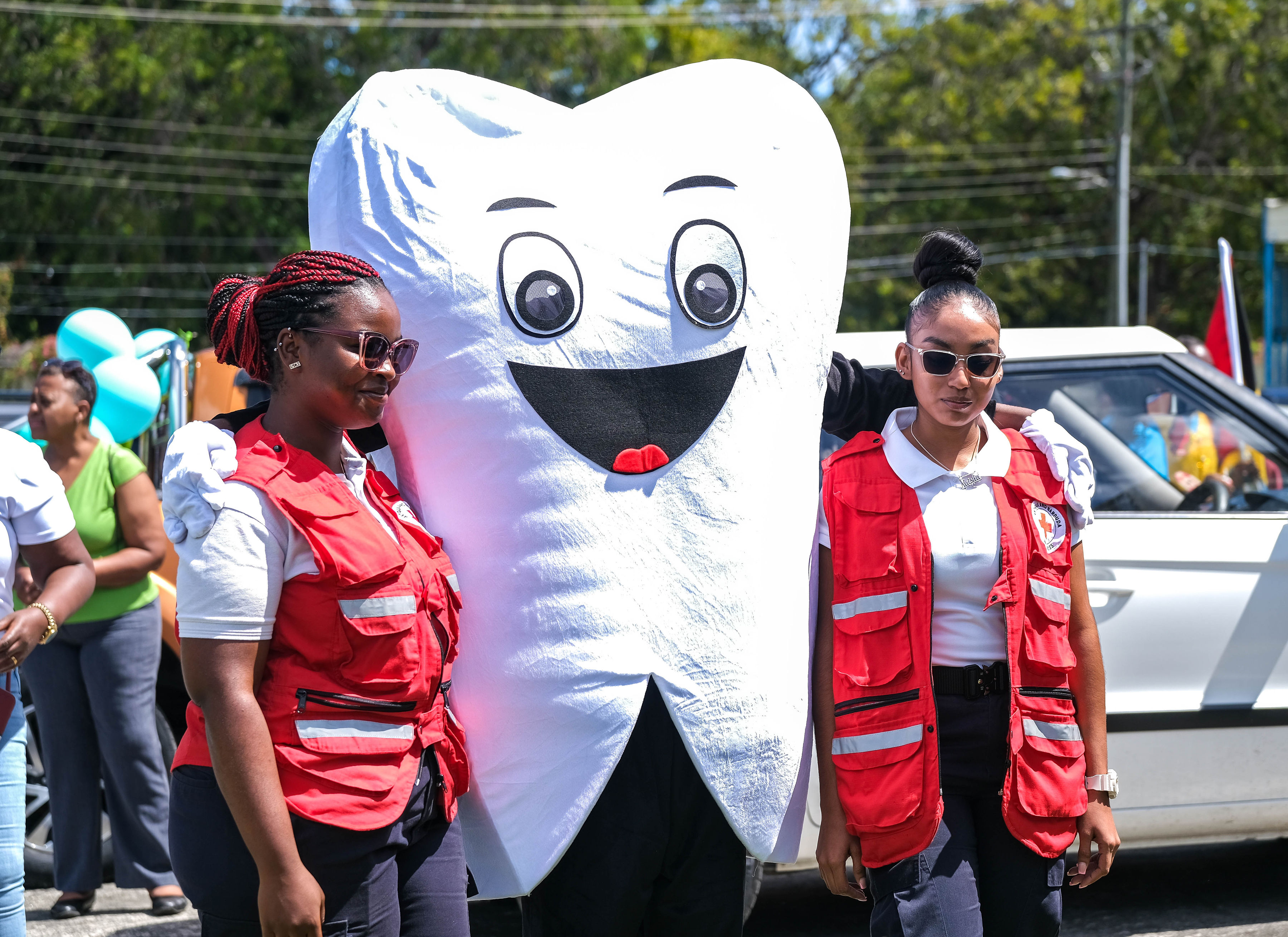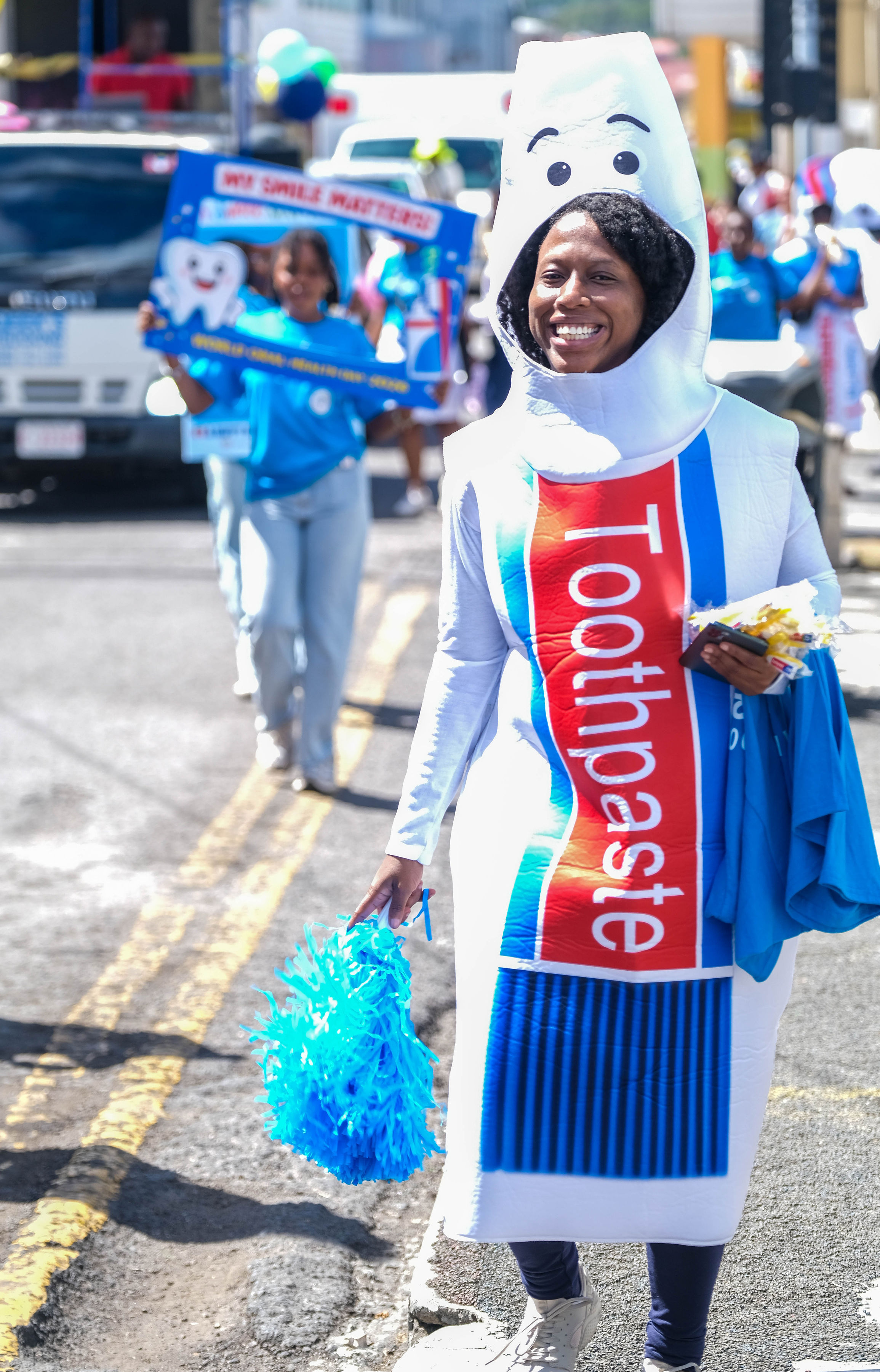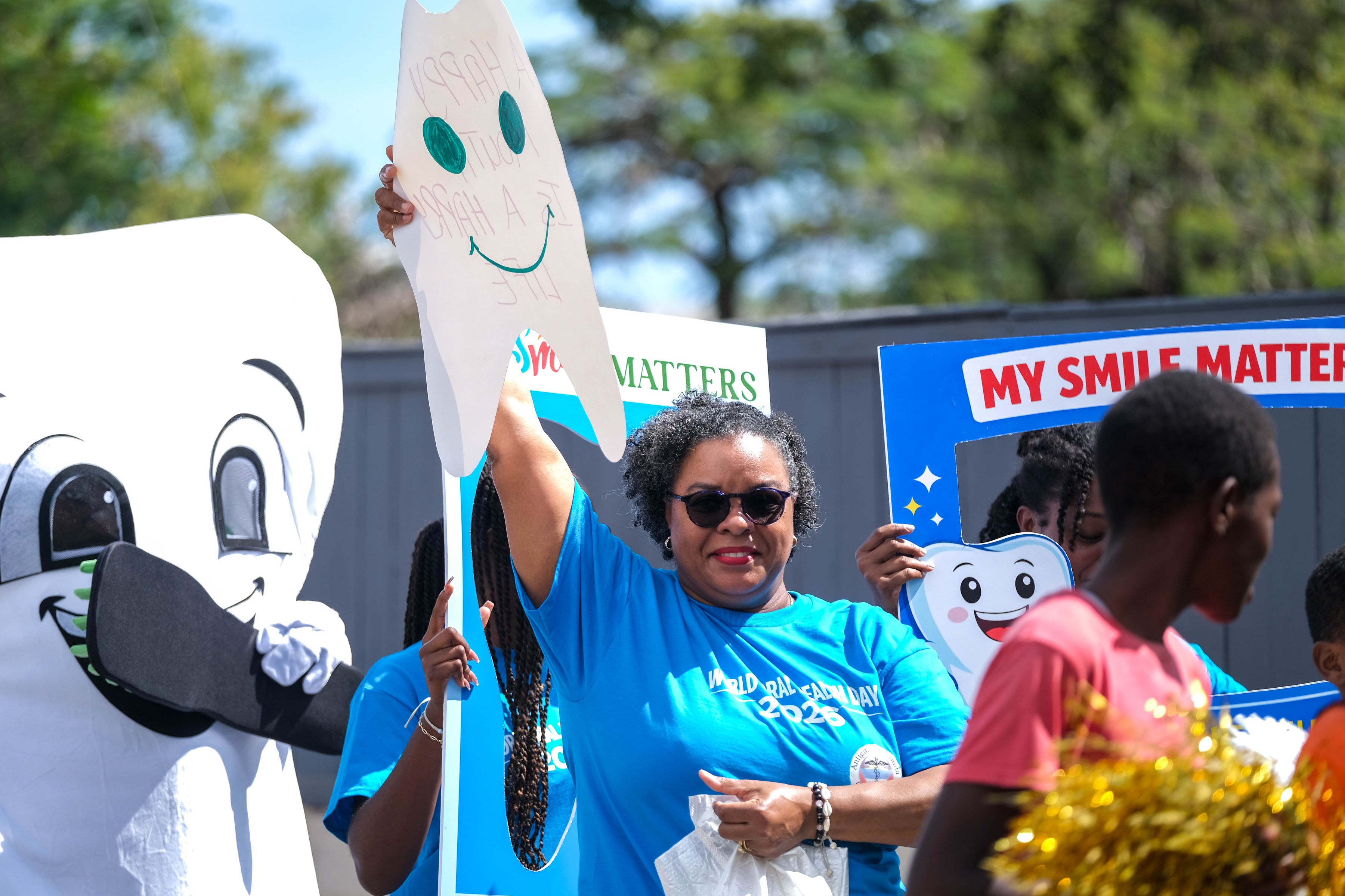 Promotion began with radio advertisements featuring Toothie, the official FDI mascot, ending with our parade message and helping to build public anticipation and awareness. The parade opened with our police escort, followed by the Bon Appétit Drum Corps and bold 3 ft by 6 ft banners displaying the World Oral Health Day message and the logos of ABDA and FDI. The procession featured Toothie, fruits, vegetables, Mr. Toothpaste, and other costumed characters; 50 children from our Sunny Smiles schools accompanied by teachers; dentists walking and driving; and two decorated trucks carrying banners with messages such as “Your Smile Matters” and “Drink Water, Eat Fruits and Vegetables,” along with the 2026 slogan. Eighteen medical students from the University of Health Sciences Medical School participated, along with volunteers, first responders, and the Antigua and Barbuda Red Cross ambulance, one of our coalition partners. Participants wore blue World Oral Health Day T-shirts, while the costumes, music, movement, and color brought oral health and nutrition education to life. A main feature of the parade was also the photo frames taken with people who were lining the streets. They enjoyed having their pictures taken. Over 1,000 toothbrushes and toothpaste were given out along with 43 certificates for dental cleanings.