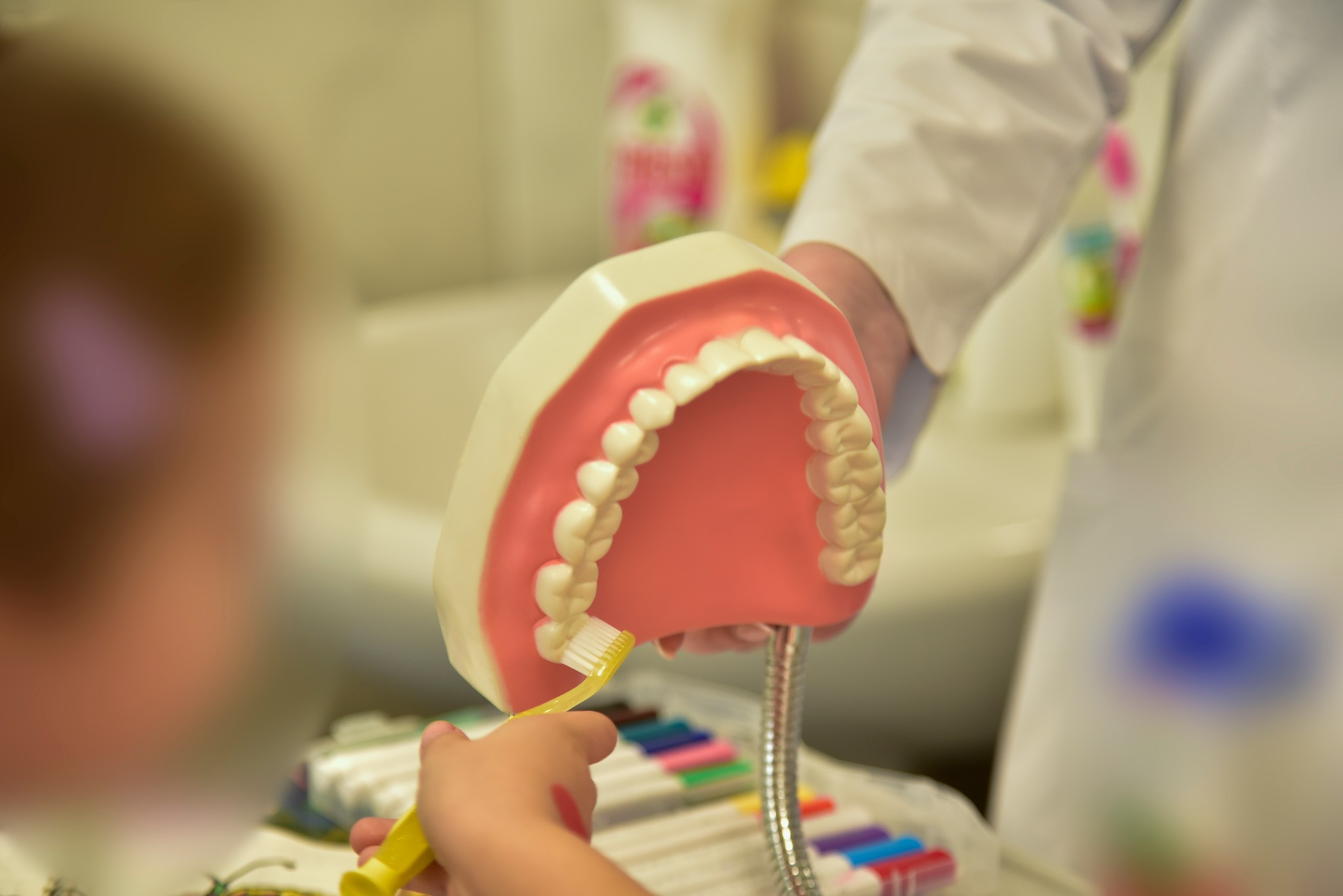 At the Pediatrics Clinic of the University Clinical Center of Kosovo, multiple interactive outreach activities were conducted with hospitalized children. These included hands-on demonstrations of toothbrushing techniques using dental models, distribution of oral hygiene materials and child-friendly educational sessions designed to promote healthy habits in a supportive and engaging environment.