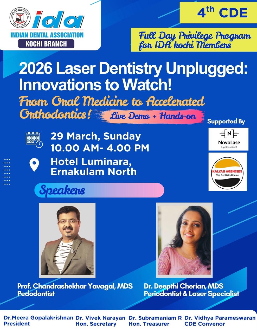 The program “Laser Dentistry Unplugged: Innovations to Watch – From Oral Medicine to Accelerated Orthodontics” is scheduled to be held on Sunday, 29th March 2026, from 10:00 AM to 4:00 PM at Hotel Luminara, Ernakulam North, Kerala, India.