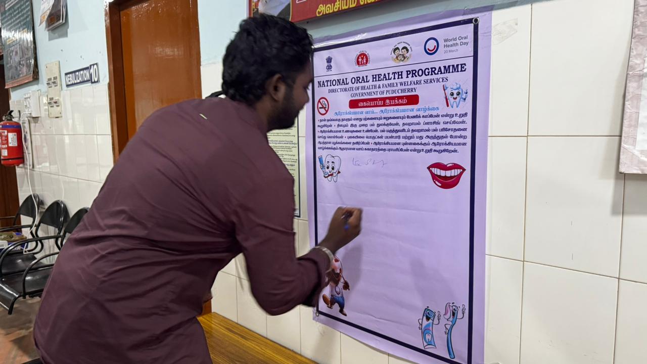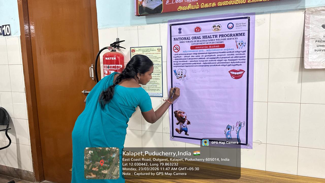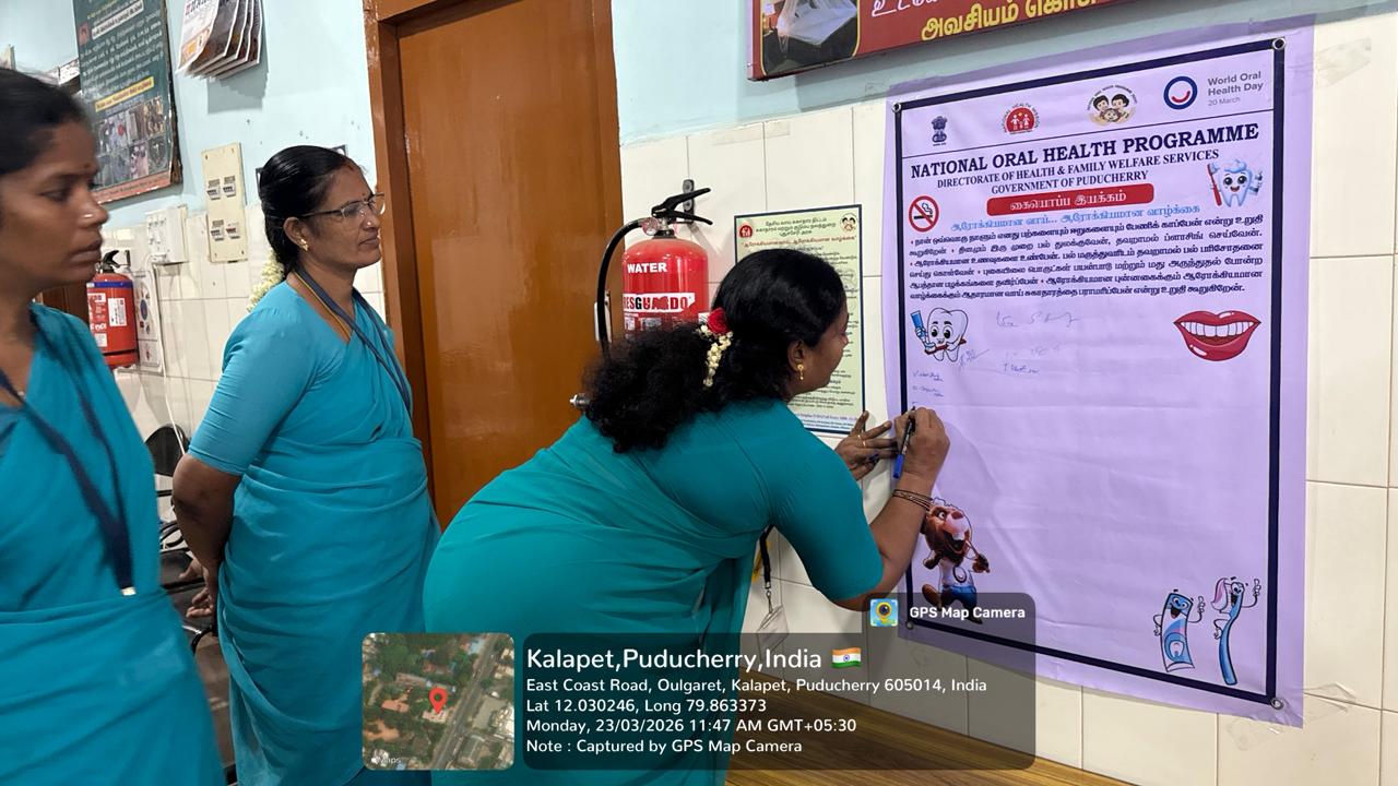 On 23.03.2026, in observance of World Oral Health Day, a signature campaign was conducted at PHC Kalapet to promote the theme “A Happy Mouth is a Happy Life.” The initiative aimed to raise awareness about the importance of maintaining good oral hygiene and its impact on overall health. Members of the public actively participated by signing the pledge, expressing their commitment to adopting healthy oral care practices. The campaign emphasized key messages such as regular brushing, balanced diet, and timely dental check-ups. Overall, the program served as an effective platform to encourage community involvement and promote long-term oral health awareness.