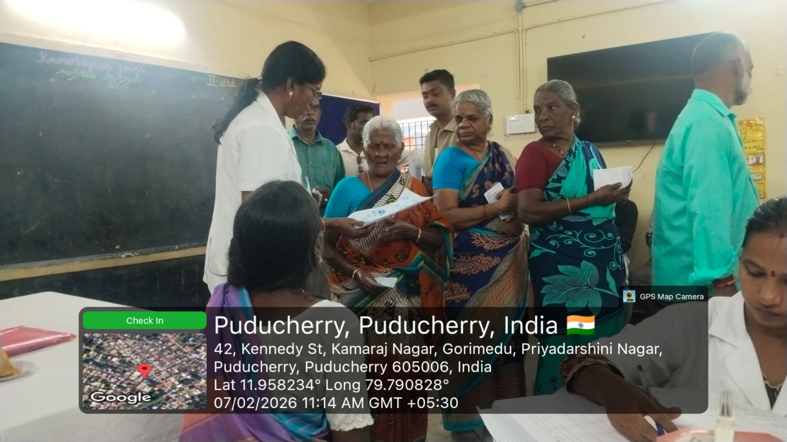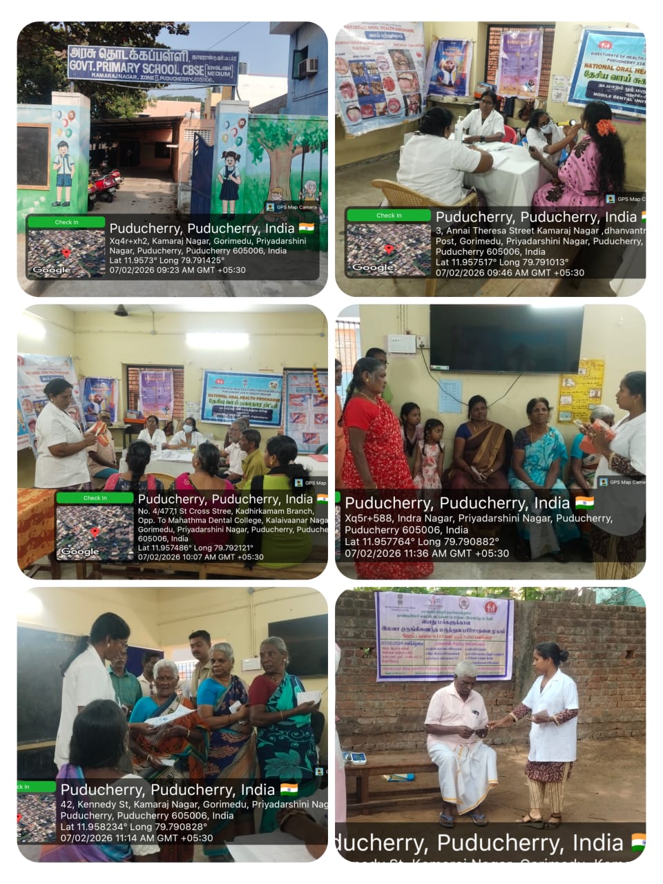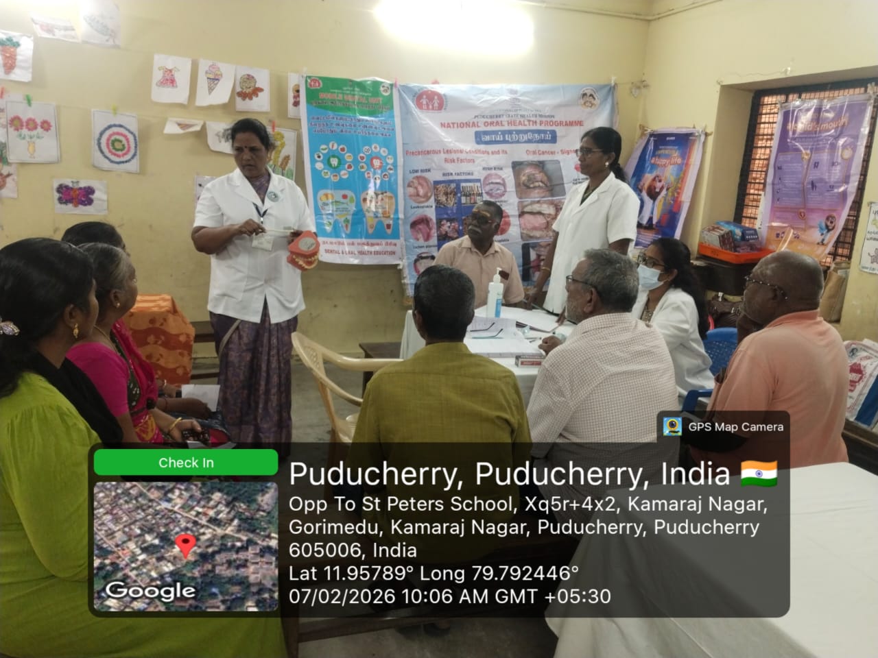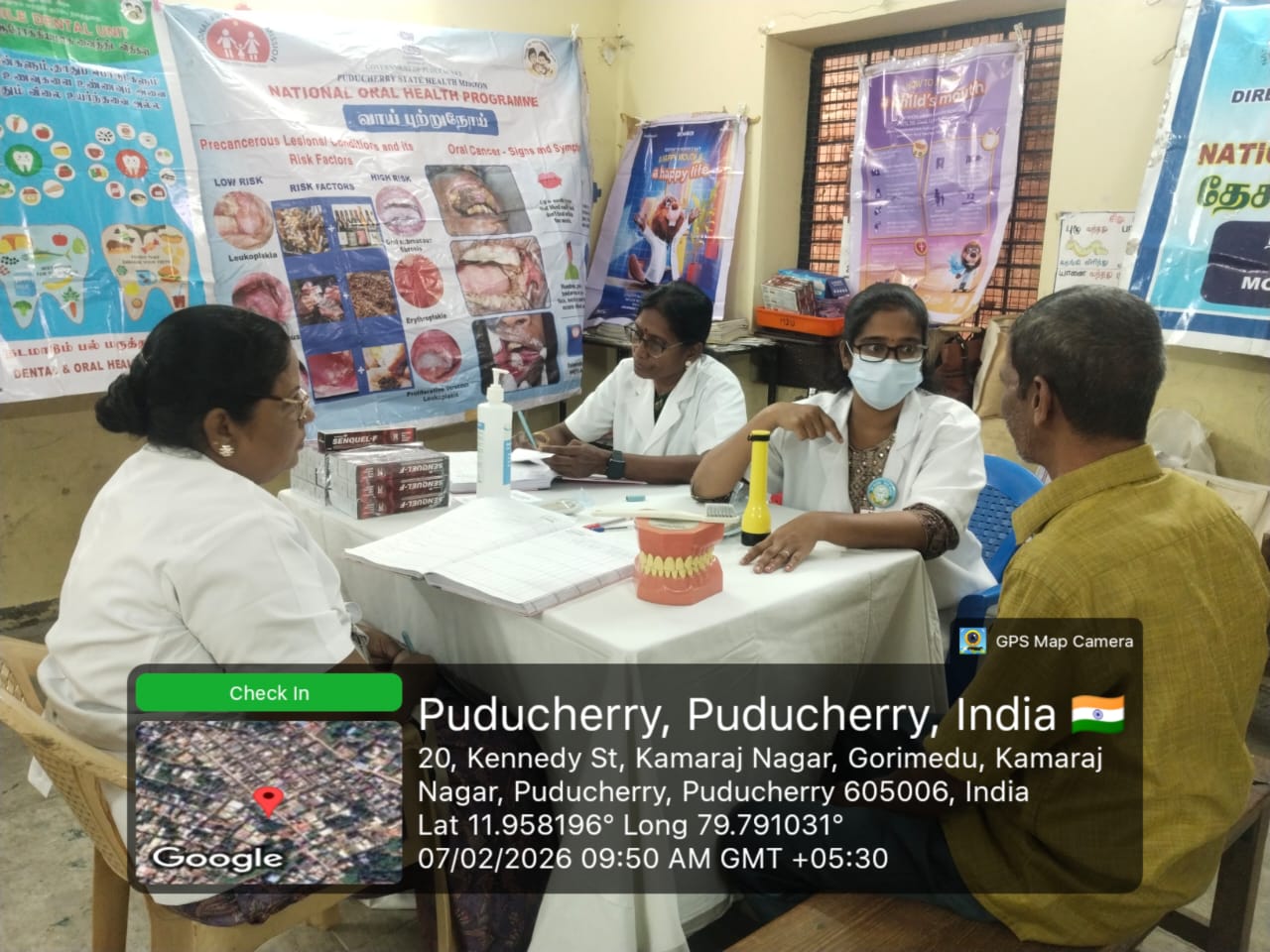 An *Oral Screening* and *Oral Awareness* Camp was successfully organized at *GPS Kamaraj Nagar* , under *PHC Gorimedu* , in collaboration with the *Pondicherry AIDS Control Society (PACS)* and *National AIDS Control Organization (NACO).* The event formed part of an *Integrated Health Camp* held on February 7, 2026.