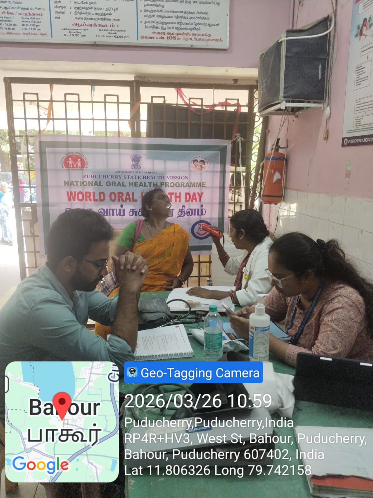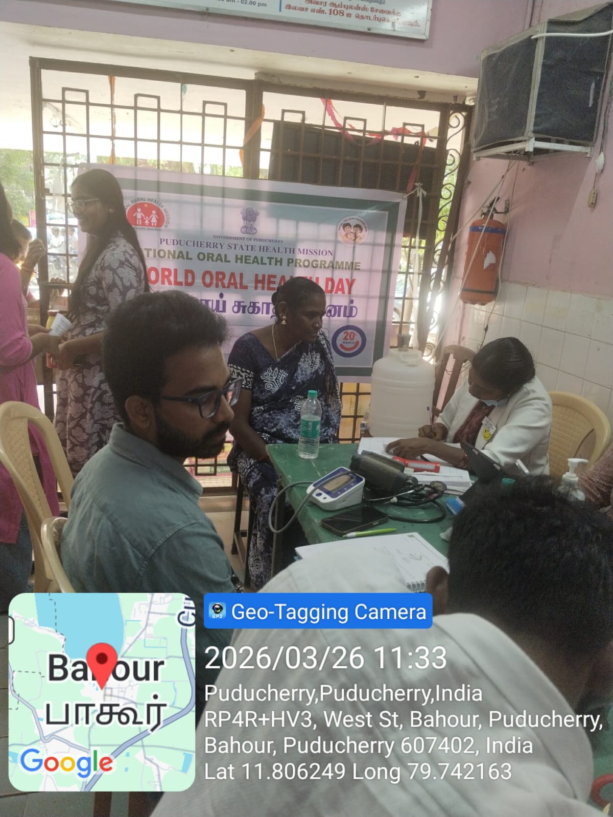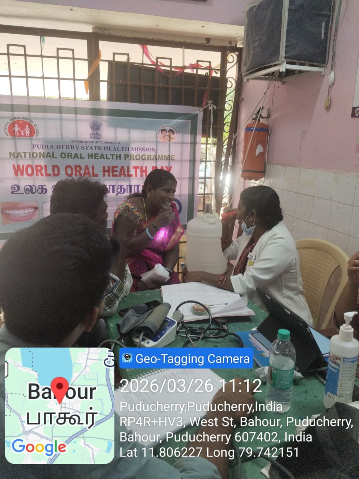 26.03.26 PHC Bahour, Oral Screening Camp ,WOHD 2026World Oral Health Day celebration dental awareness session was conducted for the well baby clinic mothers and general public. The theme “ Happy Mouth is a Happy Life" was explained, highlighting the importance of maintaining good oral hygiene, early detection of dental problems, and promoting oral health awareness among the community participated and gained useful knowledge. On account of World Oral Health Day the theme " A happy mouth is a happy life"& Oral health pamplets distributed.