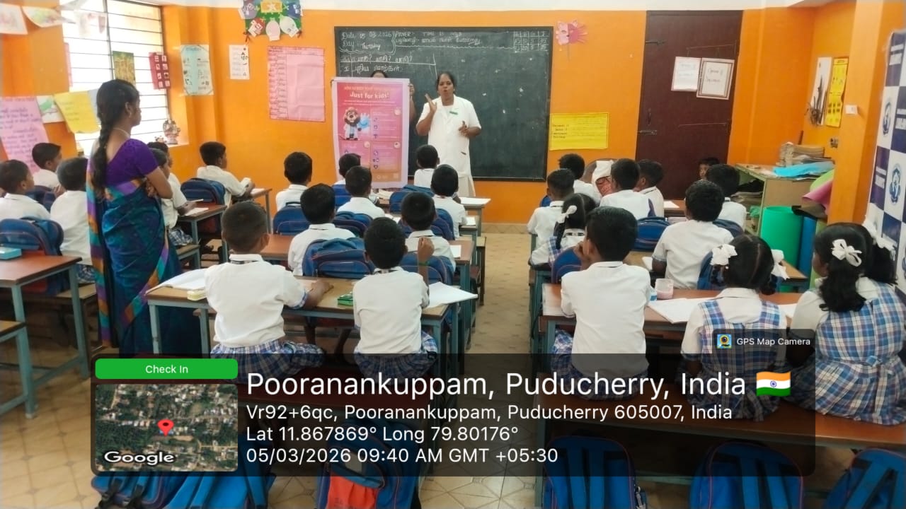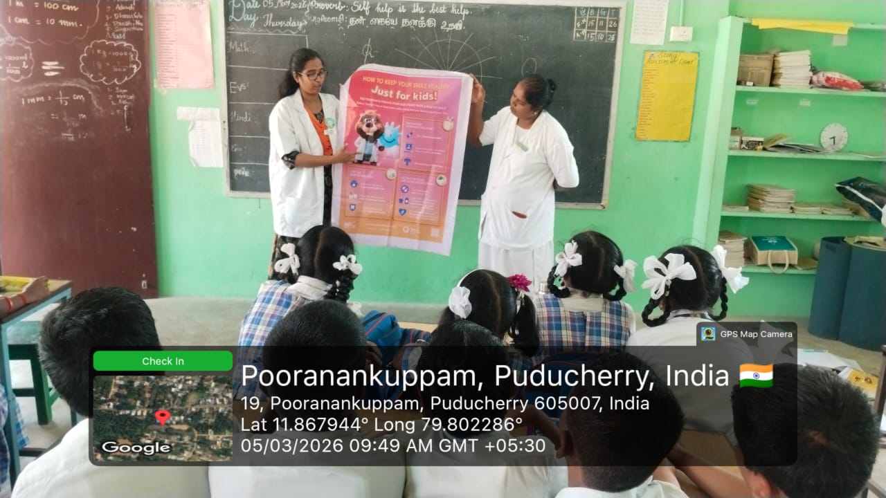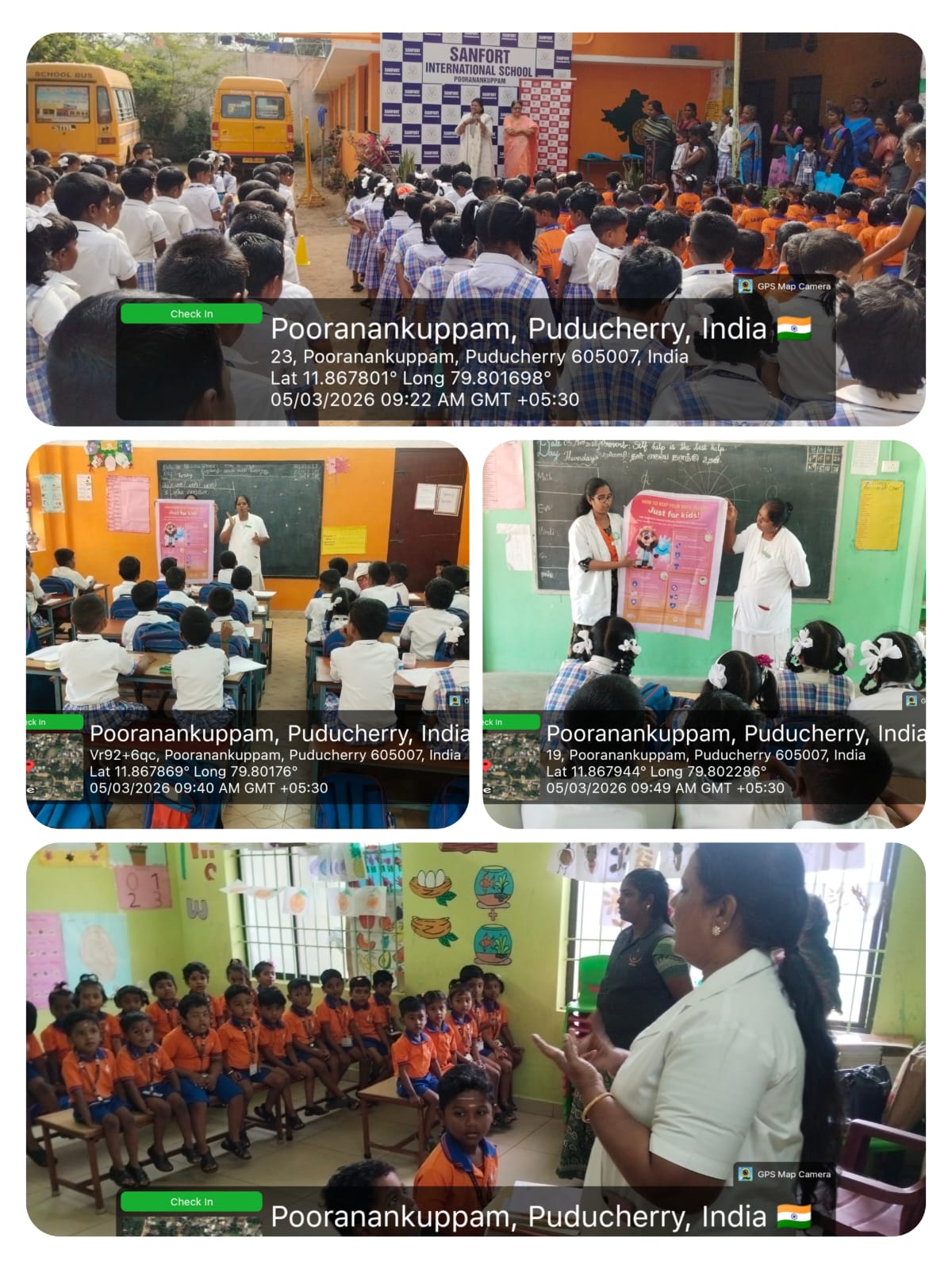 On *5/3/2026* , a *World Oral Health Day celebration* was conducted at *Sanfort International School* , Pooranankuppam. As part of the program and in connection with *Women’s Day celebrations,* an oral health awareness session was conducted for the students. The importance of maintaining good oral hygiene and regular dental check-ups was explained in an interactive manner. Proper brushing techniques were demonstrated to encourage healthy habits among children through _Toothie_ fact sheet and models. In addition, a _colouring_ competition based on the theme of *A Happy Mouth...Is A Happy Life* was organized to promote creativity and awareness among the students. The activity helped students understand the importance of keeping their mouth healthy. Nearly *250* students benefited from the program.