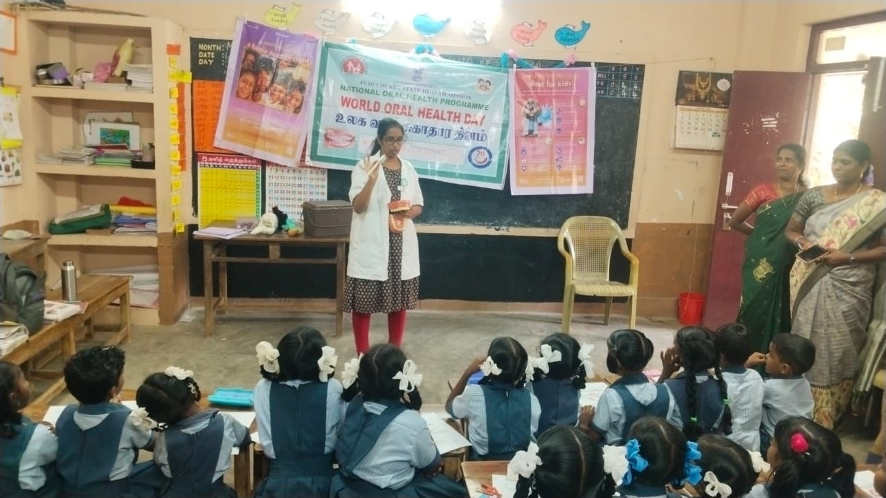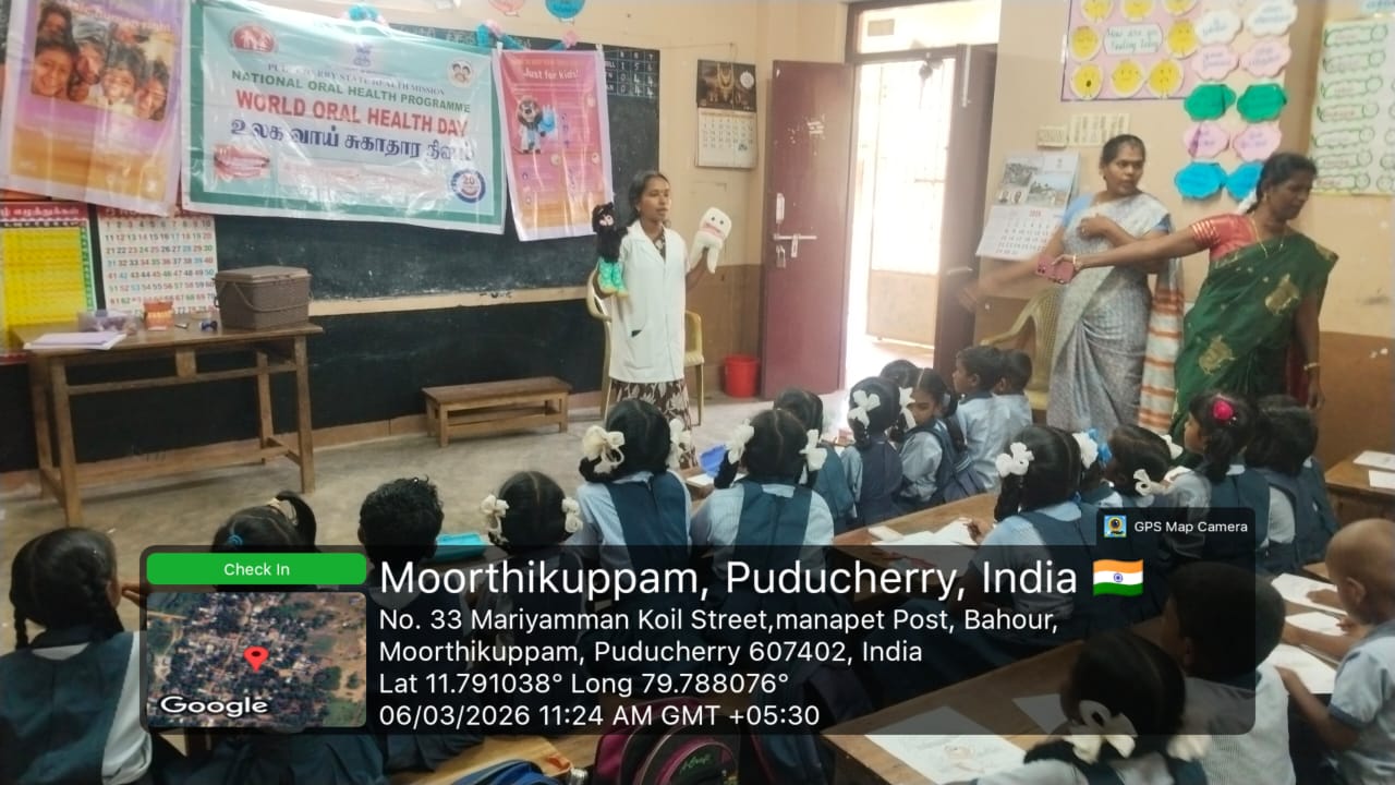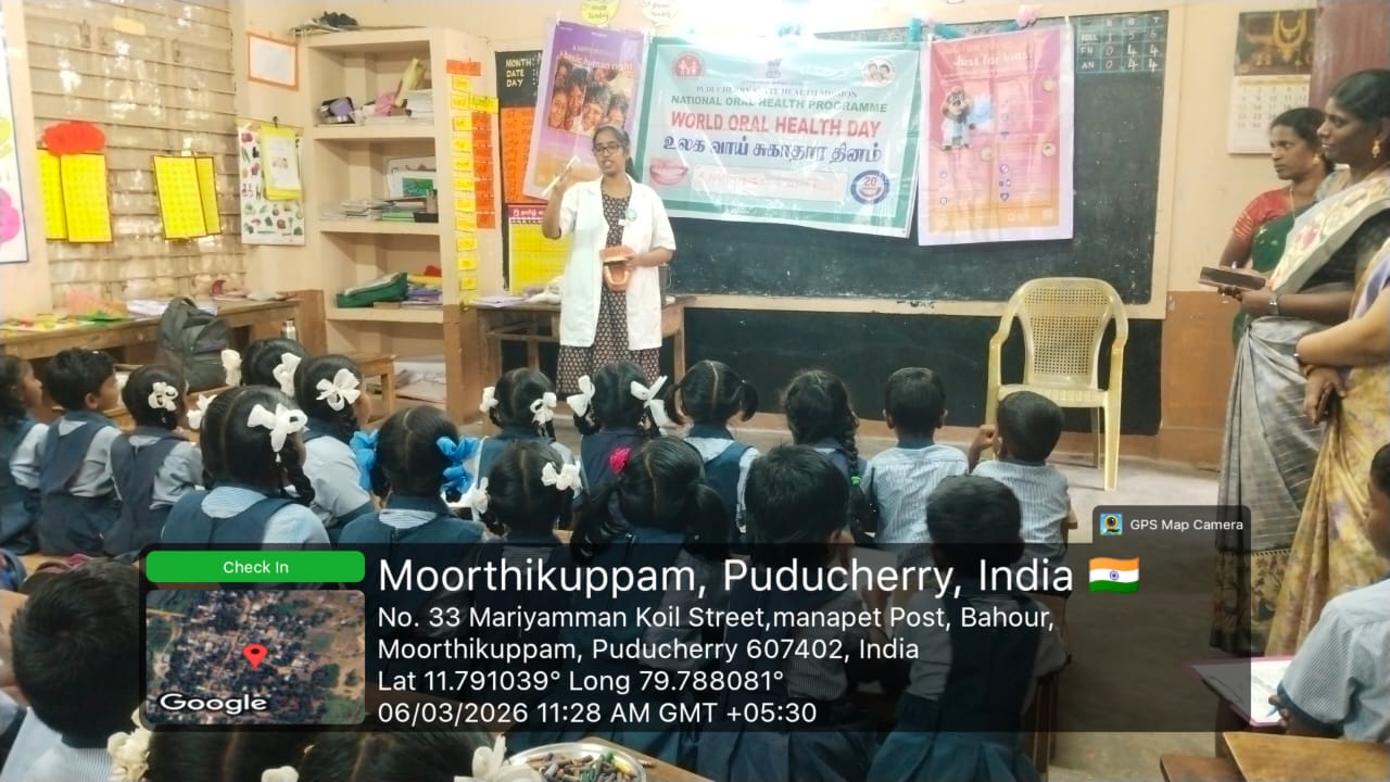 As part of the World Oral Health Day celebration, a coloring competition was conducted at *GPS Moorthikuppam* for the students of 4th and 5th standard on 6/3/26.. The activity was organized to create awareness about oral health among school children. The theme “ *Happy Mouth is a Happy Life”* was explained, and students enthusiastically participated in the *Toothie* doll coloring competition. Through this creative activity, children learned the importance of maintaining good oral hygiene and caring for their teeth from an early age. The competition encouraged students to express their ideas about healthy smiles through art. Nearly *63* students benefited from this program.