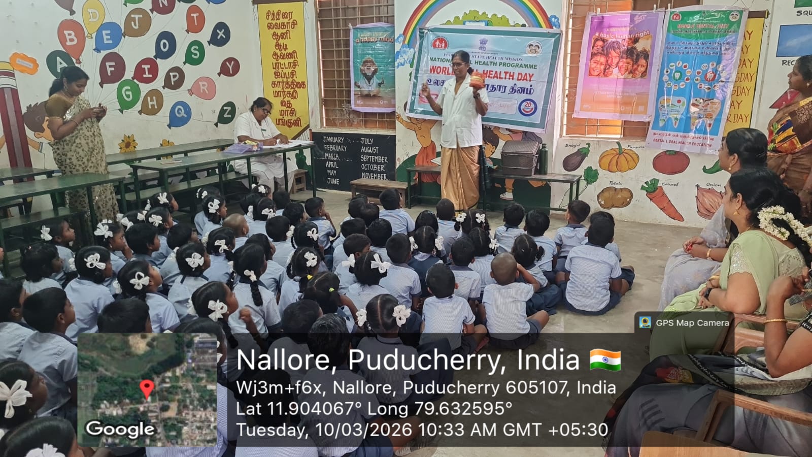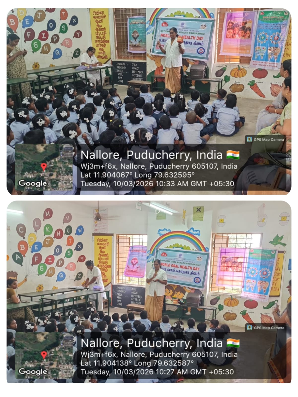 WOHD Celebration: An oral health awareness talk was conducted for the students of *Government Primary School, Nallore* on 10.03.2026. The session focused on the importance of maintaining good oral hygiene to prevent common dental problems such as tooth decay and gum diseases. Proper brushing techniques were demonstrated using a brushing model to help students understand the correct method of cleaning their teeth. The importance of brushing twice daily, reducing sugary food intake, and visiting the dentist regularly was also explained. Students actively participated and clarified their doubts during the session. The program was informative and beneficial, and nearly *85* students benefited from this awareness activity.