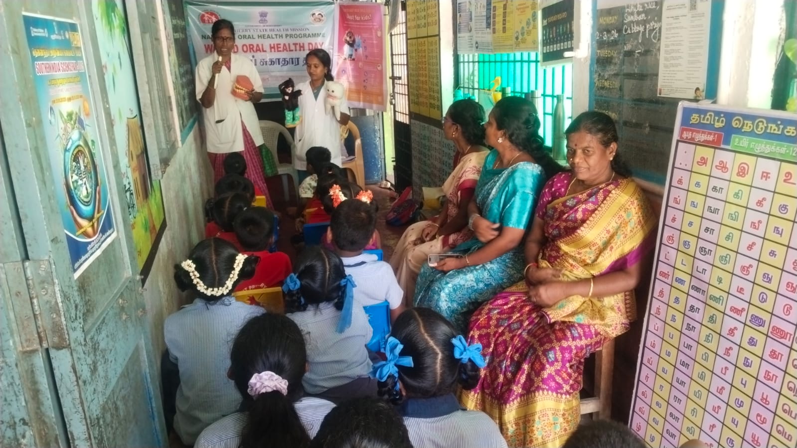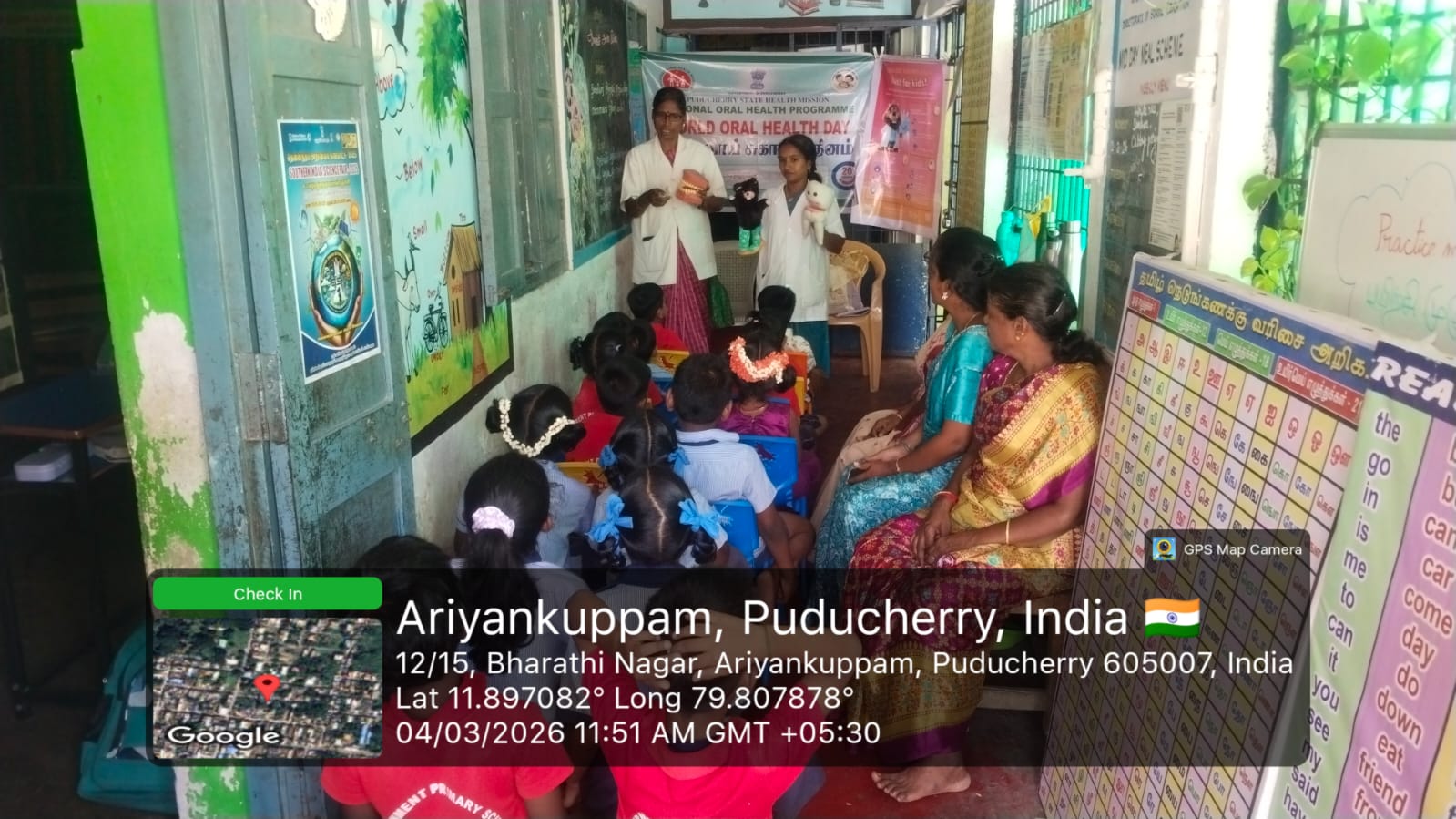 As part of the *World Oral Health Day (WOHD)* 2026 celebration, an oral health awareness session was conducted at *Government Primary School - Ariyankuppampet* on 04.03.2026. The session aimed to educate children about the importance of maintaining good oral hygiene for a healthy life. Proper brushing techniques were demonstrated using dental models and a toothie doll to make the learning process interactive and enjoyable. Students were taught the correct method and duration of brushing, along with the importance of rinsing after meals. The program was well received, and nearly *35* benefited from this informative and engaging session.