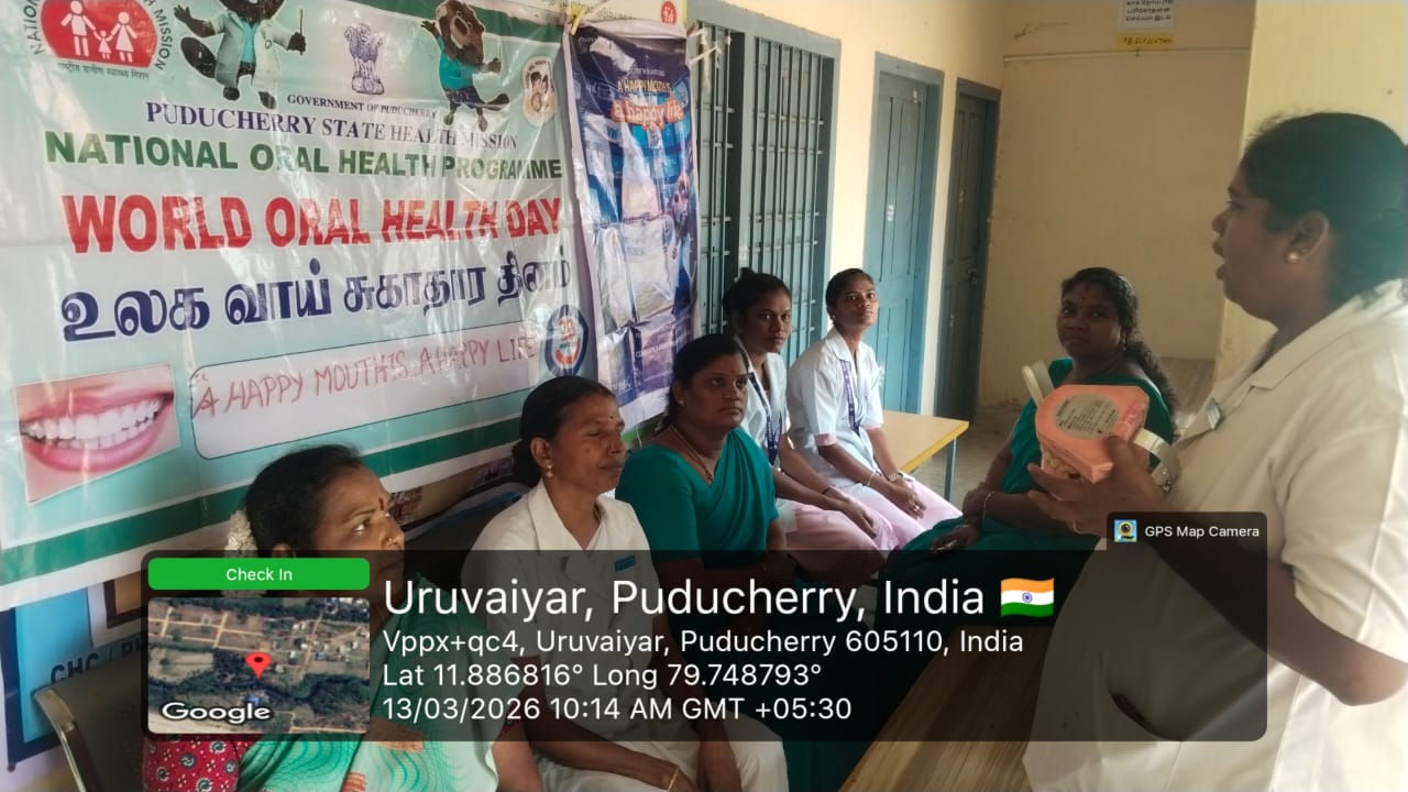 As a part of _World Oral Health Day celebration_ , a dental orientation session was conducted for the health workers at the *Sub-Center, Uruvaiyar* , on 13.03.2026. Nearly _15_ health workers participated and benefited from the session. The theme “ *Happy Mouth is a Happy Life”* was explained, highlighting the importance of maintaining good oral hygiene, early detection of dental problems, and promoting oral health awareness among the community. The staff actively participated and gained useful knowledge to educate the public.