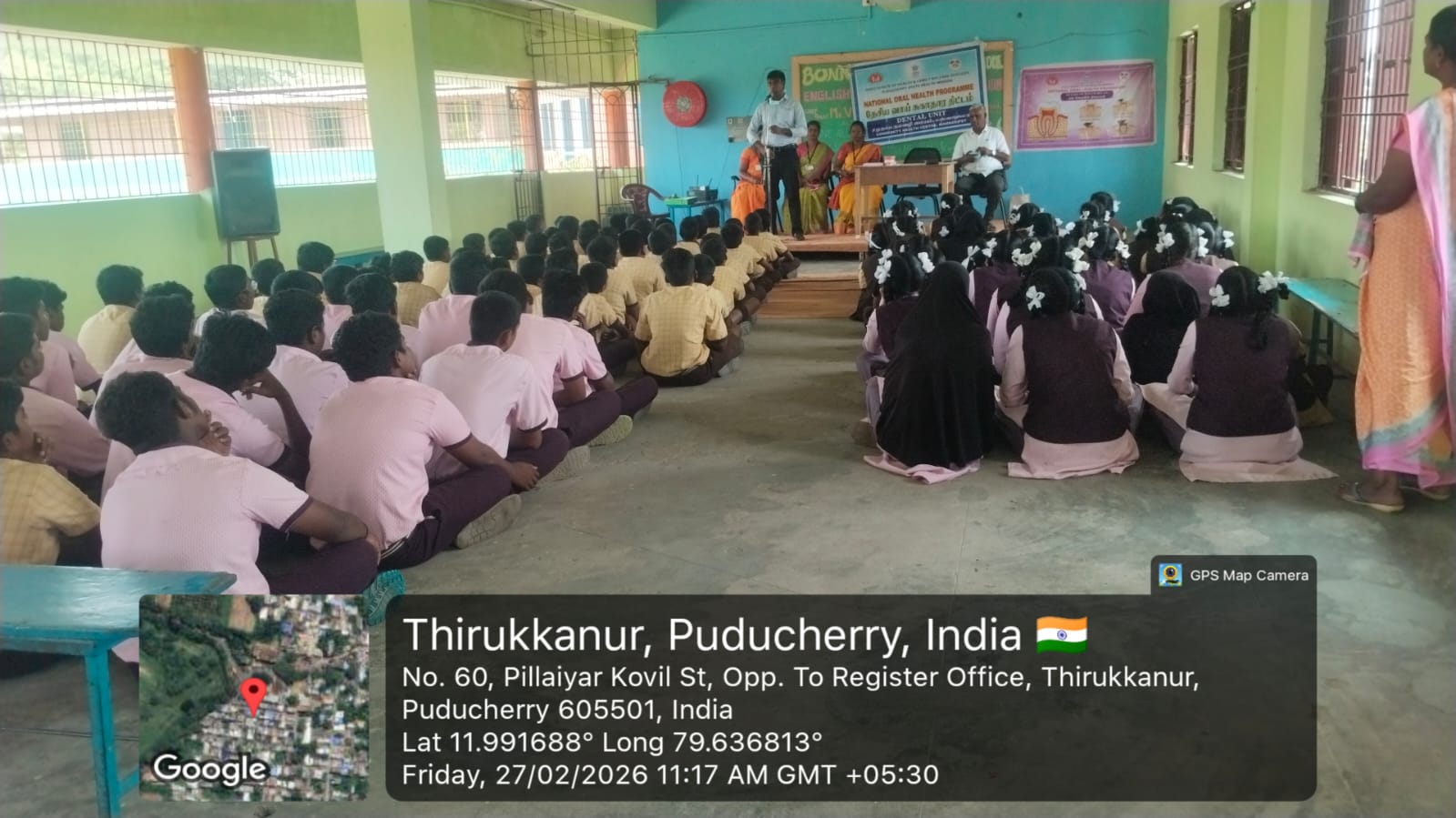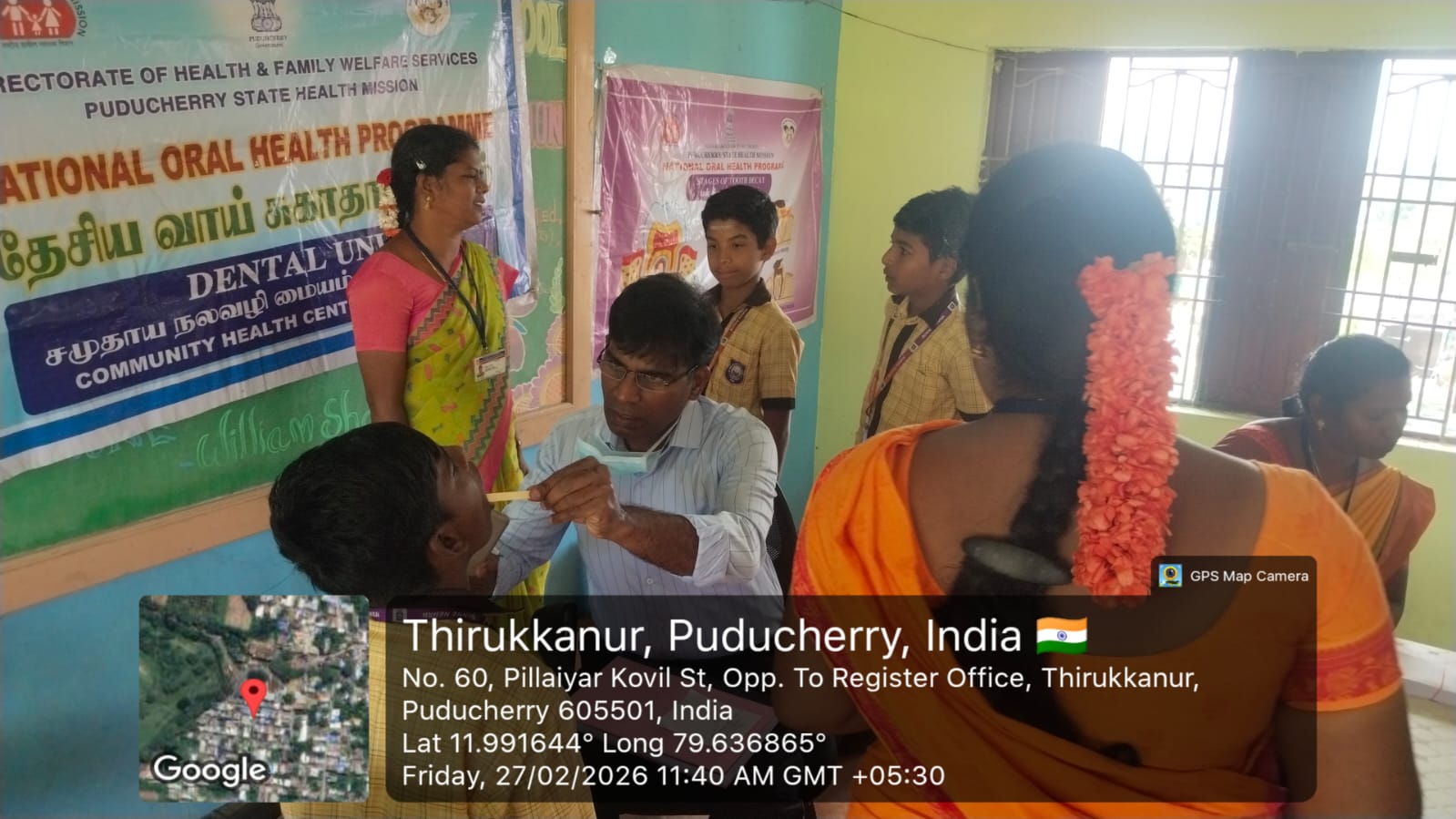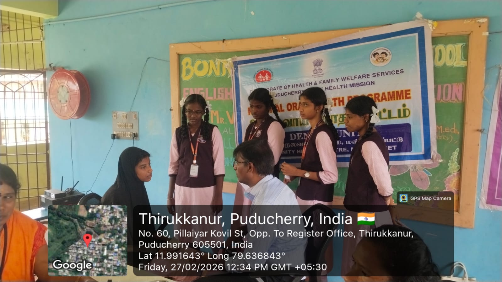 "27/2/26. CHC Mannadipet An oral screening camp conducted at Bonne Nehru Higher Secondary School Thirukanur .°During the camp, dental check-ups were carried out to identify common oral health problems such as dental caries, gum diseases, and oral lesions.