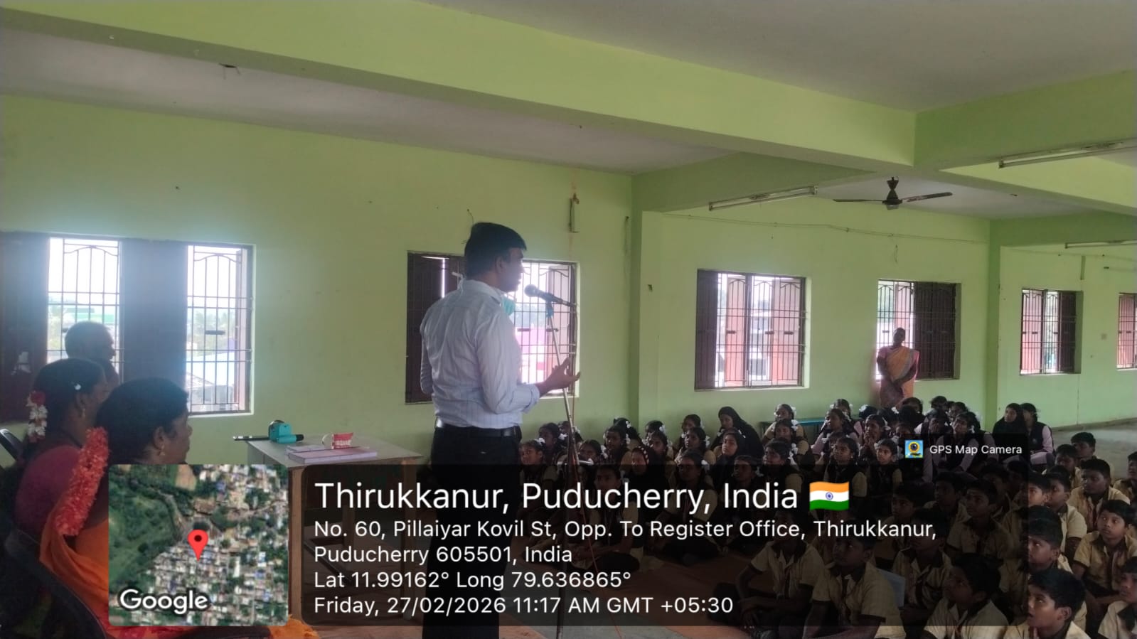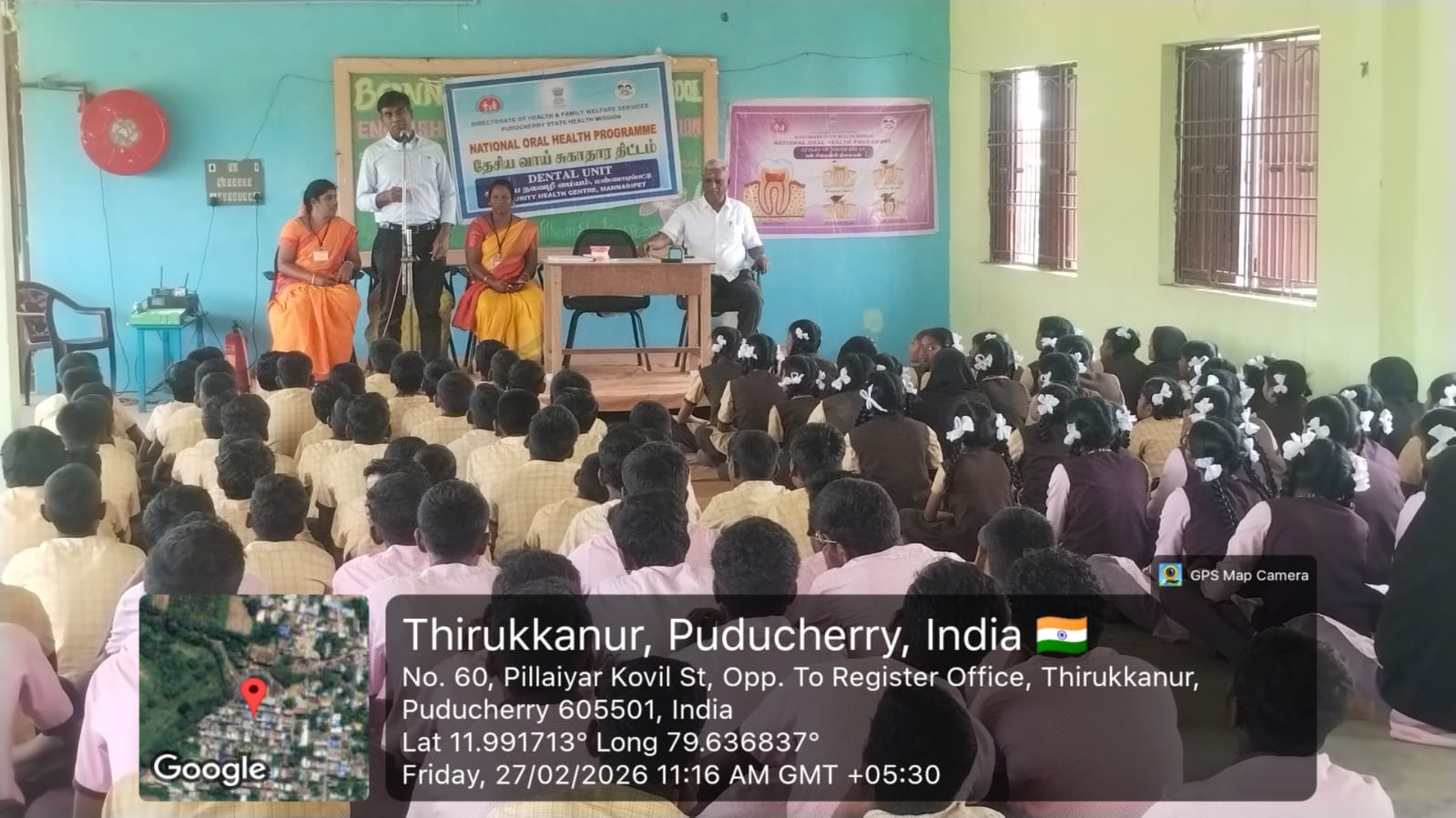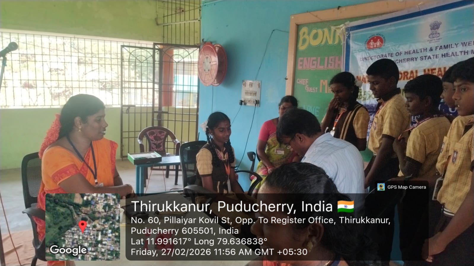 "27/2/26. CHC Mannadipet An oral screening camp conducted at Bonne Nehru Higher Secondary School Thirukanur .°During the camp, dental check-ups were carried out to identify common oral health problems such as dental caries, gum diseases, and oral lesions.