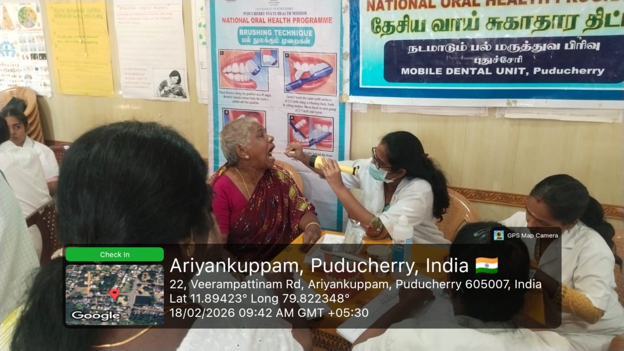 An oral screening camp was conducted at *Periyaveerampattinam* on 18-02-2026 as part of the _Seashore Integrated Health Camp_ organized by *Pondicherry AIDS Society Organization.* The camp aimed to improve oral health awareness and provide early screening services to the coastal community. Informative fact sheets were displayed to educate the public about the harmful effects of tobacco use and the importance of maintaining good oral hygiene.