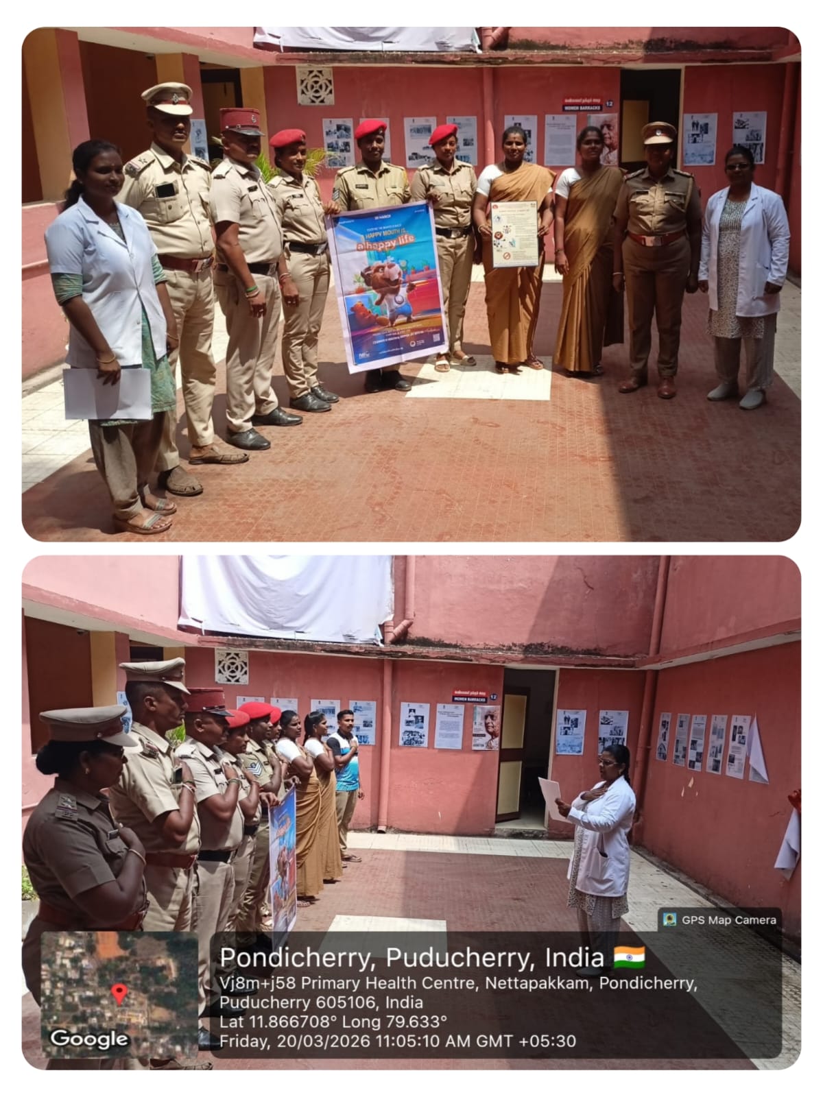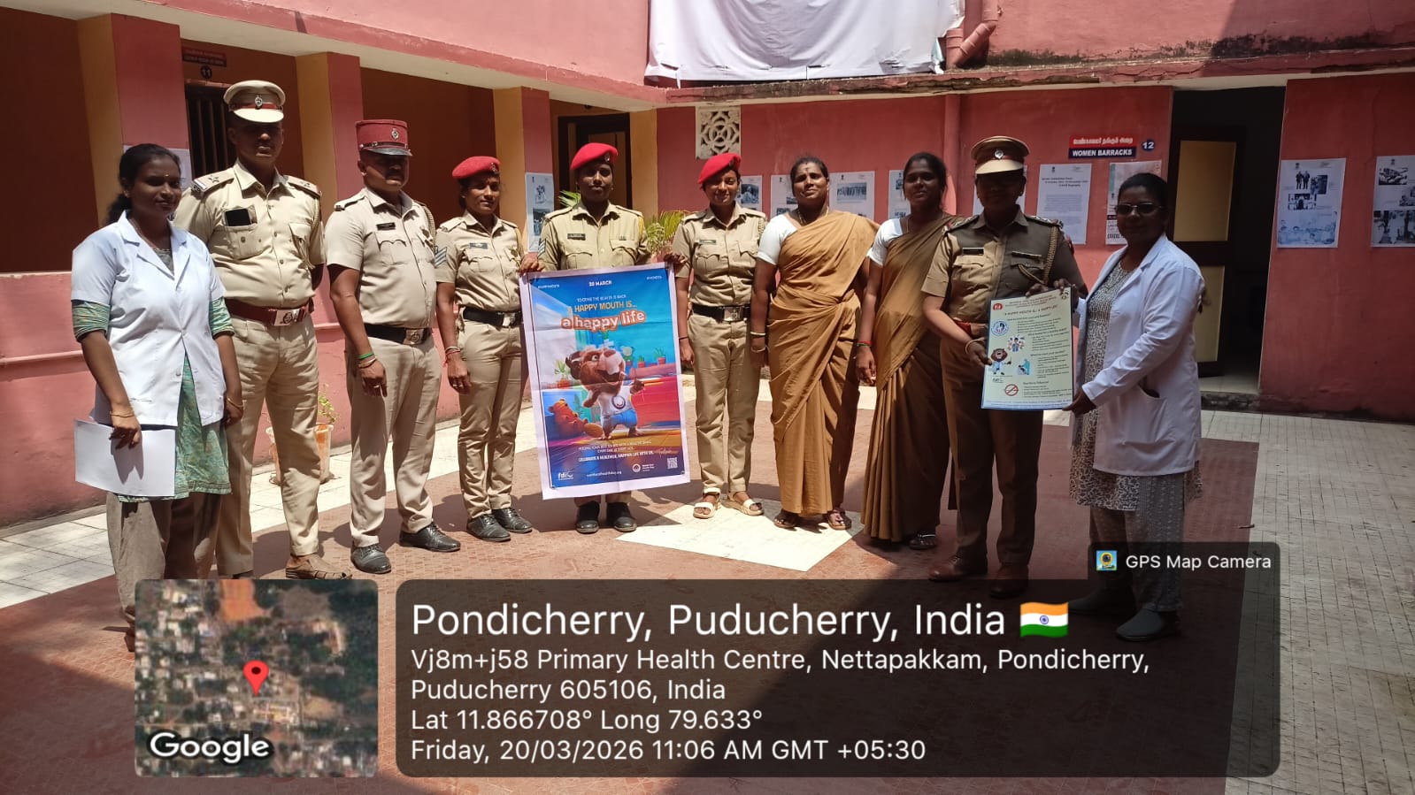 On 20/03/2026, as part of WOHD Celebration 2026, an oral health awareness program was conducted at Nettapakkam Police Station by PHC Nettapakkam. Awareness on do’s and don’ts of oral care was provided, followed by an oral health pledge. Pamphlets and posters were distributed. A total of 9 beneficiaries and 2 health staff participated.