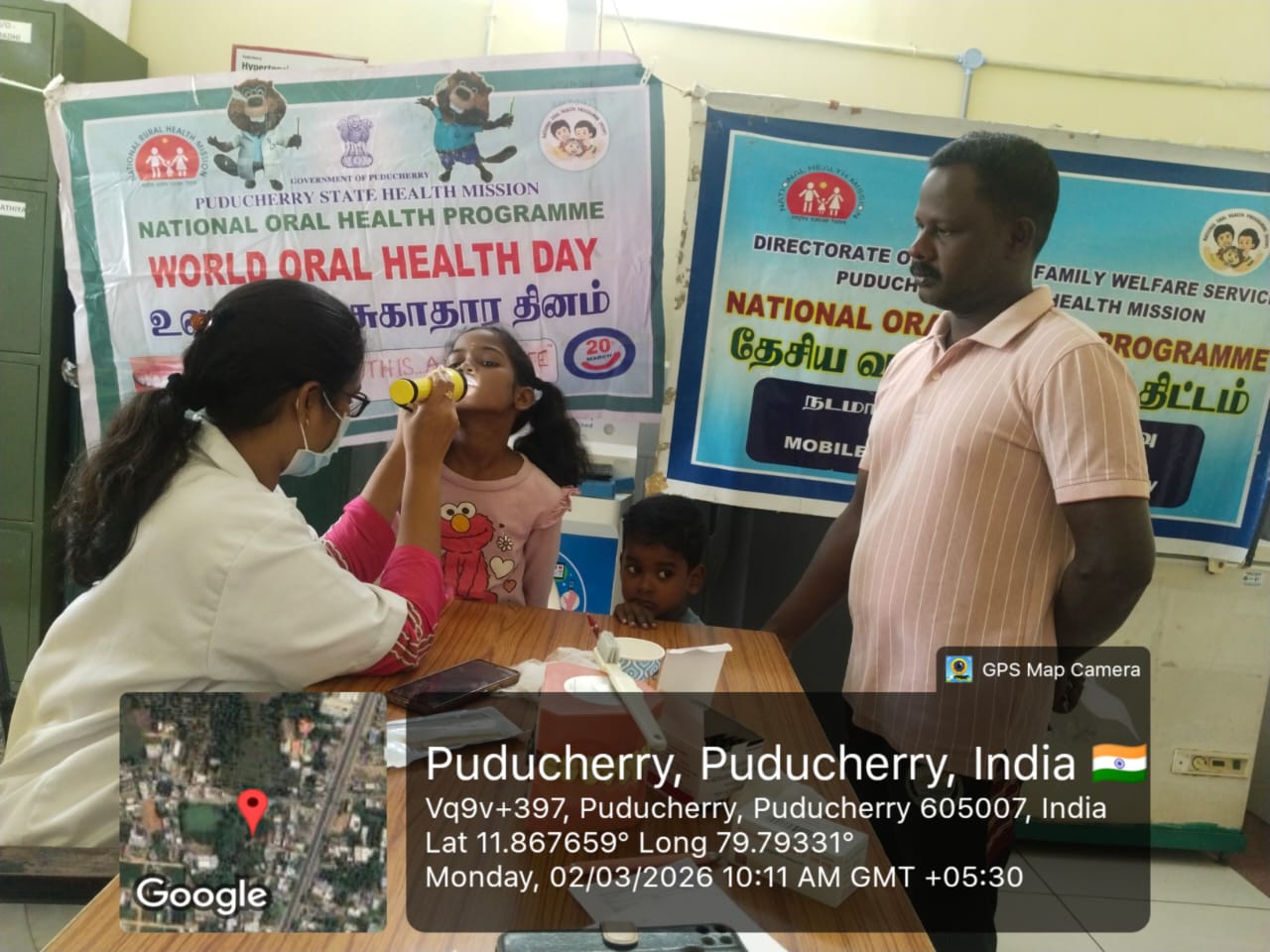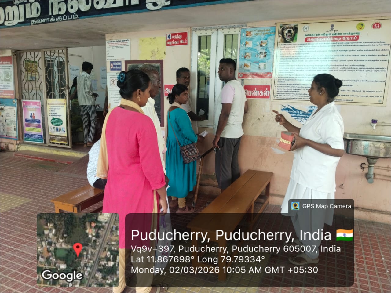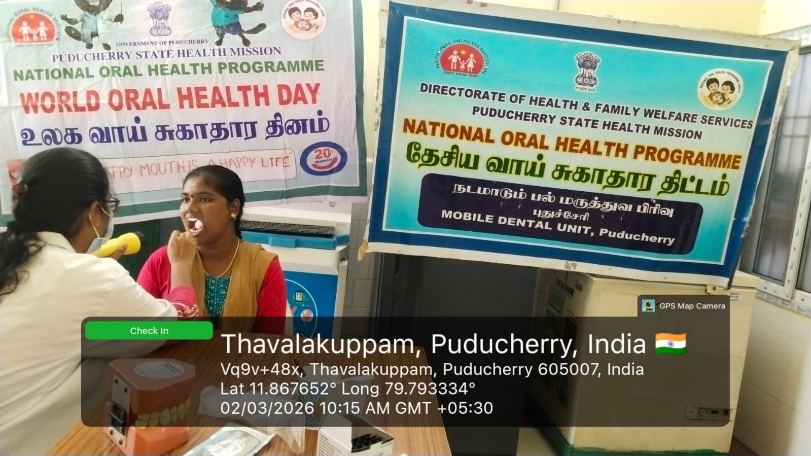 On behalf of **World Oral Health Day Celebration* _2026_ ,* an oral screening camp was conducted at *AAM PHC Thavalakuppam* for the general public. The program aimed to create awareness about the importance of maintaining good oral hygiene and preventing dental diseases. Brushing techniques were demonstrated using dental models to educate participants on proper oral care practices. Informative posters highlighting common dental problems and preventive measures were displayed for better understanding. The theme “ *Happy Mouth is a Happy Life”* was clearly explained, emphasizing the connection between oral health and overall well-being. Nearly *25* beneficiaries attended the camp and benefited from the screening and awareness session.