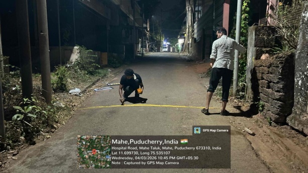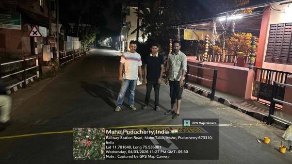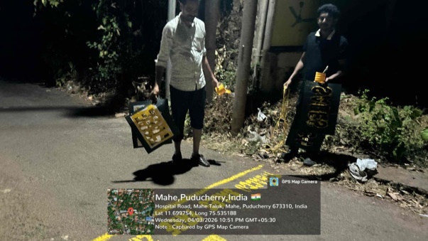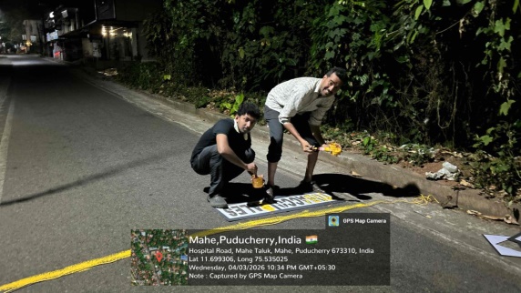 Demarcation lines of Tobacco Sales Free Zone along with correction of controversial old lines in Mahe region was carried out at Midnight by Mr Adarsh P Epidemiologist, Mr Abhishek Dialysis Tech and Dr Satish B DNO NTCP & NOHP at midnight of 4th March 2026