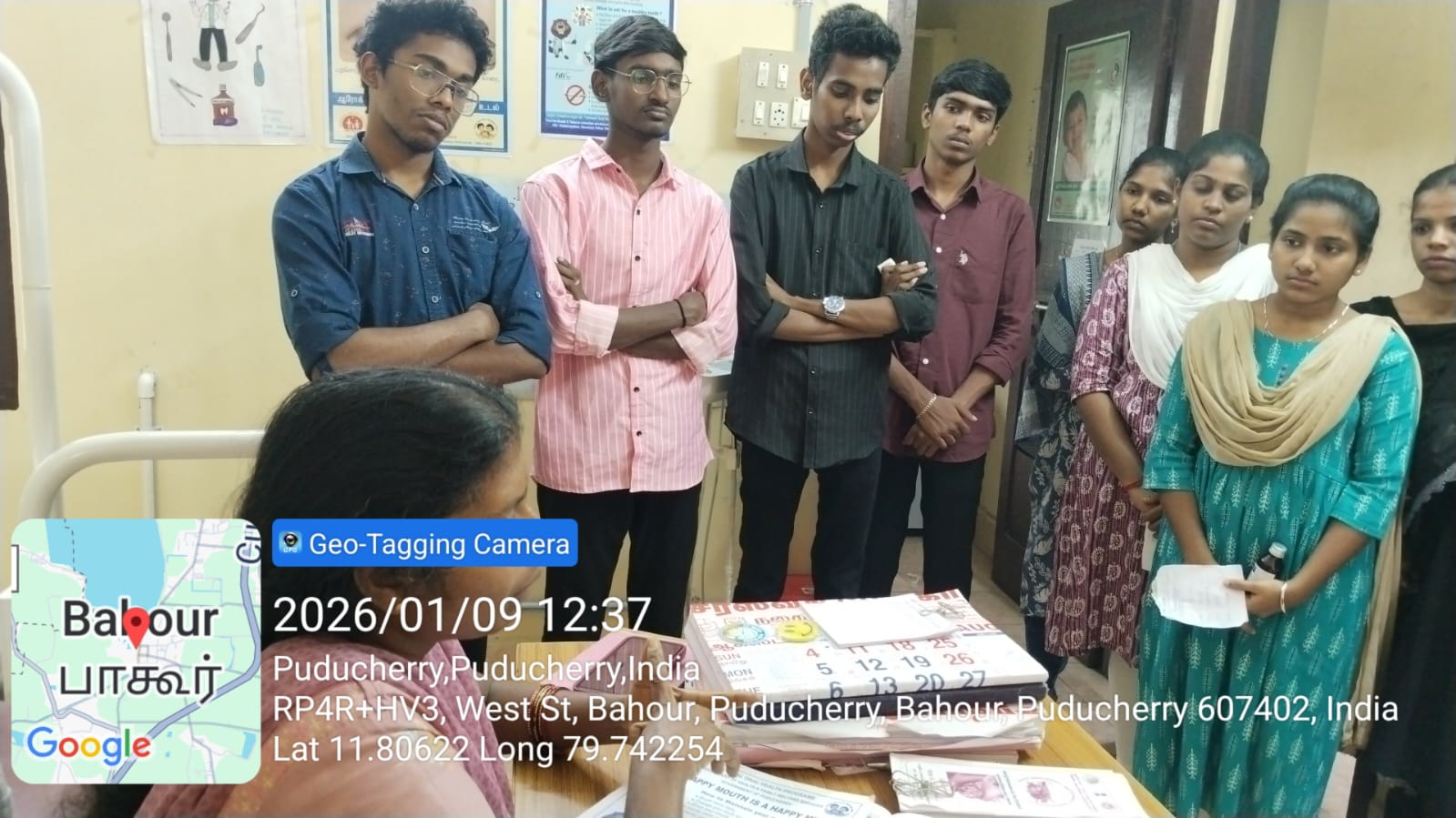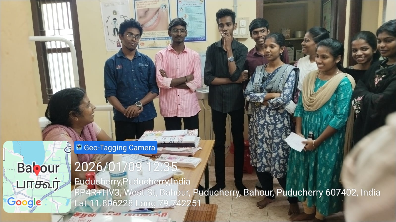 On 09.01.26, a dental check-up and treatment camp was conducted for first-year B.Sc. Nursing students at PHC Bahour from AG Padmavathi Nursing College. An oral health orientation session was delivered focusing on oral disease identification, prevention, and early intervention. Students were also briefed about the Ayushman Arogya Mandir setup and its services. An awareness talk on the harmful effects of tobacco use, quitting methods, and counseling services available at the Tobacco Cessation Clinic (TCC), PHC Bahour, including NRT availability, was provided. Pamphlets were distributed. A total of 15 students benefited from the program.