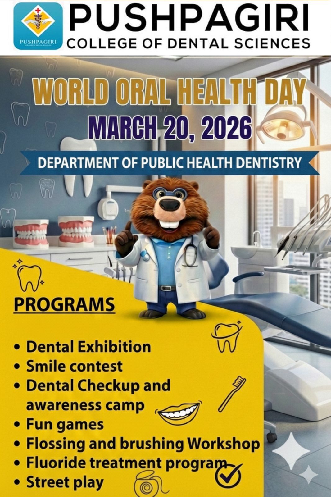 Pushpagiri College of Dental Sciences, Thiruvalla, Kerala, India is organising numerous programmes for the improving the oral health of the community in Kerala. The various programmes are being conducted from 1st January 2026 to 31st March 2026.