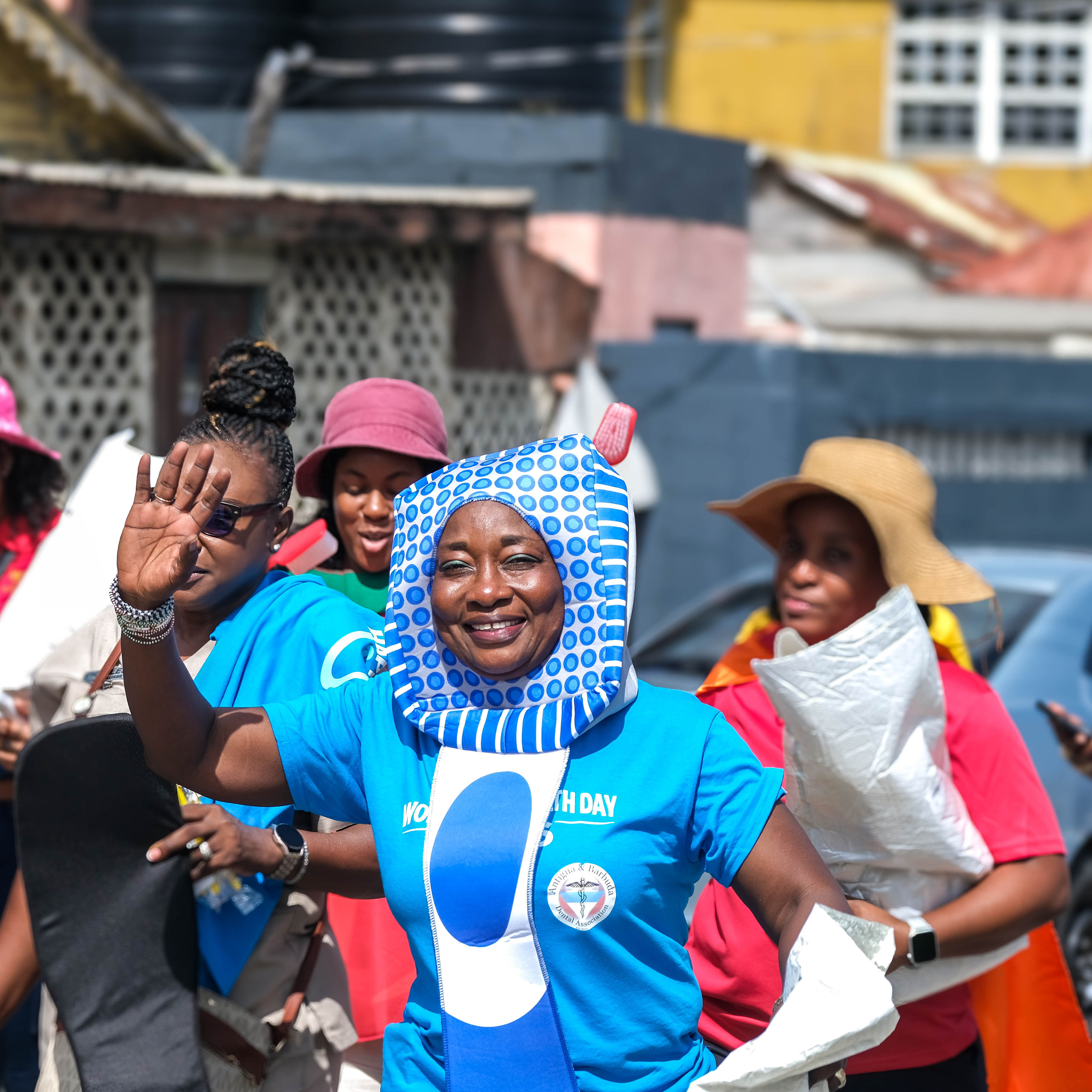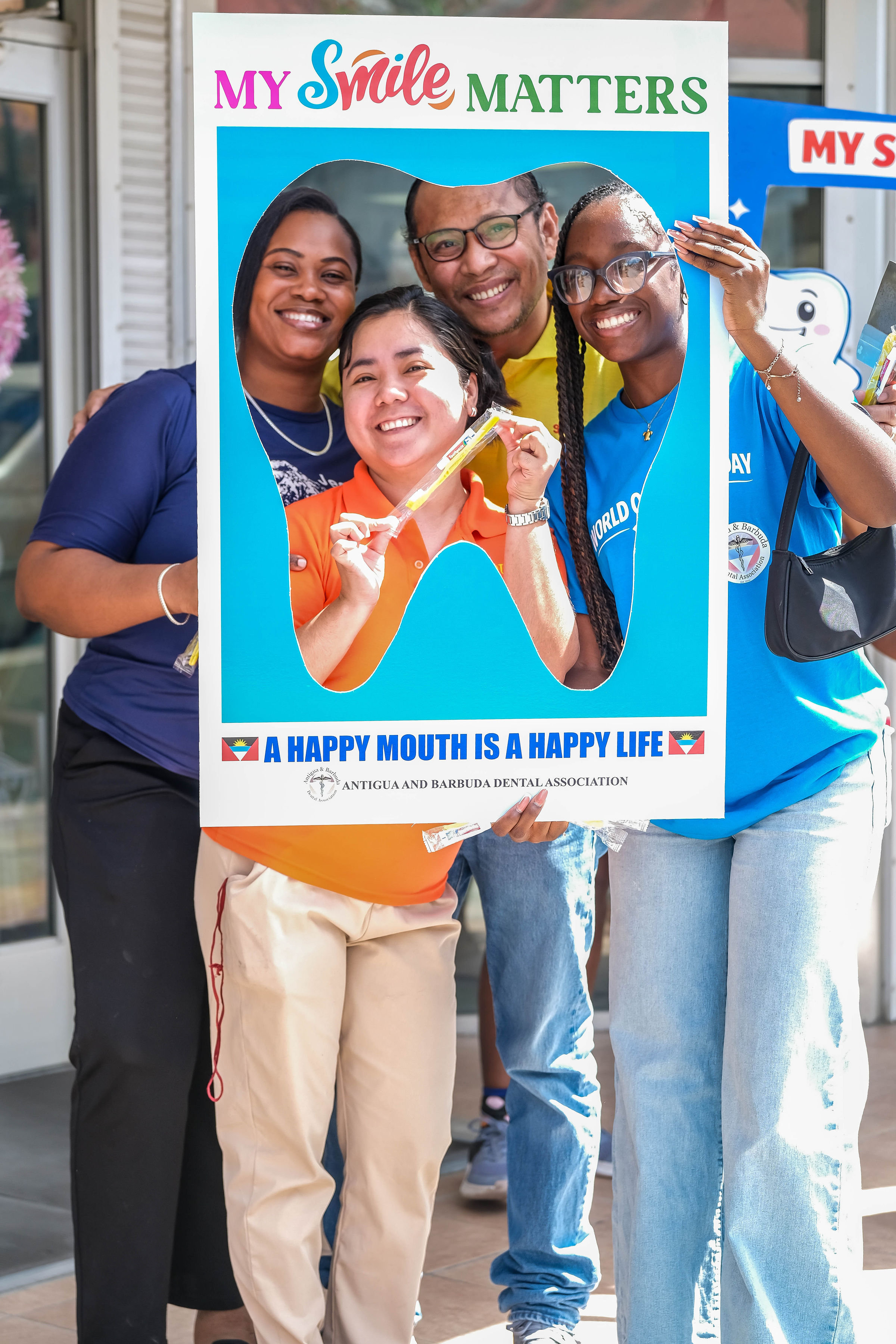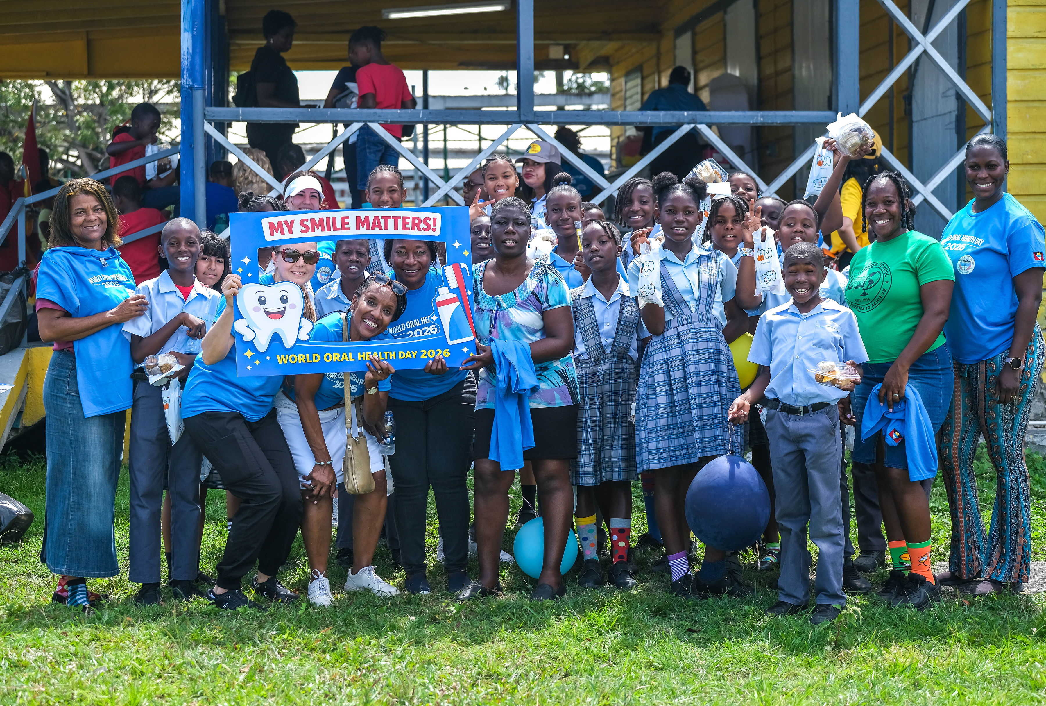 Promotion began with radio advertisements featuring Toothie, the official FDI mascot, ending with our parade message and helping to build public anticipation and awareness. The parade opened with our police escort, followed by the Bon Appétit Drum Corps and bold 3 ft by 6 ft banners displaying the World Oral Health Day message and the logos of ABDA and FDI. The procession featured Toothie, fruits, vegetables, Mr. Toothpaste, and other costumed characters; 50 children from our Sunny Smiles schools accompanied by teachers; dentists walking and driving; and two decorated trucks carrying banners with messages such as “Your Smile Matters” and “Drink Water, Eat Fruits and Vegetables,” along with the 2026 slogan. Eighteen medical students from the University of Health Sciences Medical School participated, along with volunteers, first responders, and the Antigua and Barbuda Red Cross ambulance, one of our coalition partners. Participants wore blue World Oral Health Day T-shirts, while the costumes, music, movement, and color brought oral health and nutrition education to life. A main feature of the parade was also the photo frames taken with people who were lining the streets. They enjoyed having their pictures taken. Over 1,000 toothbrushes and toothpaste were given out along with 43 certificates for dental cleanings.