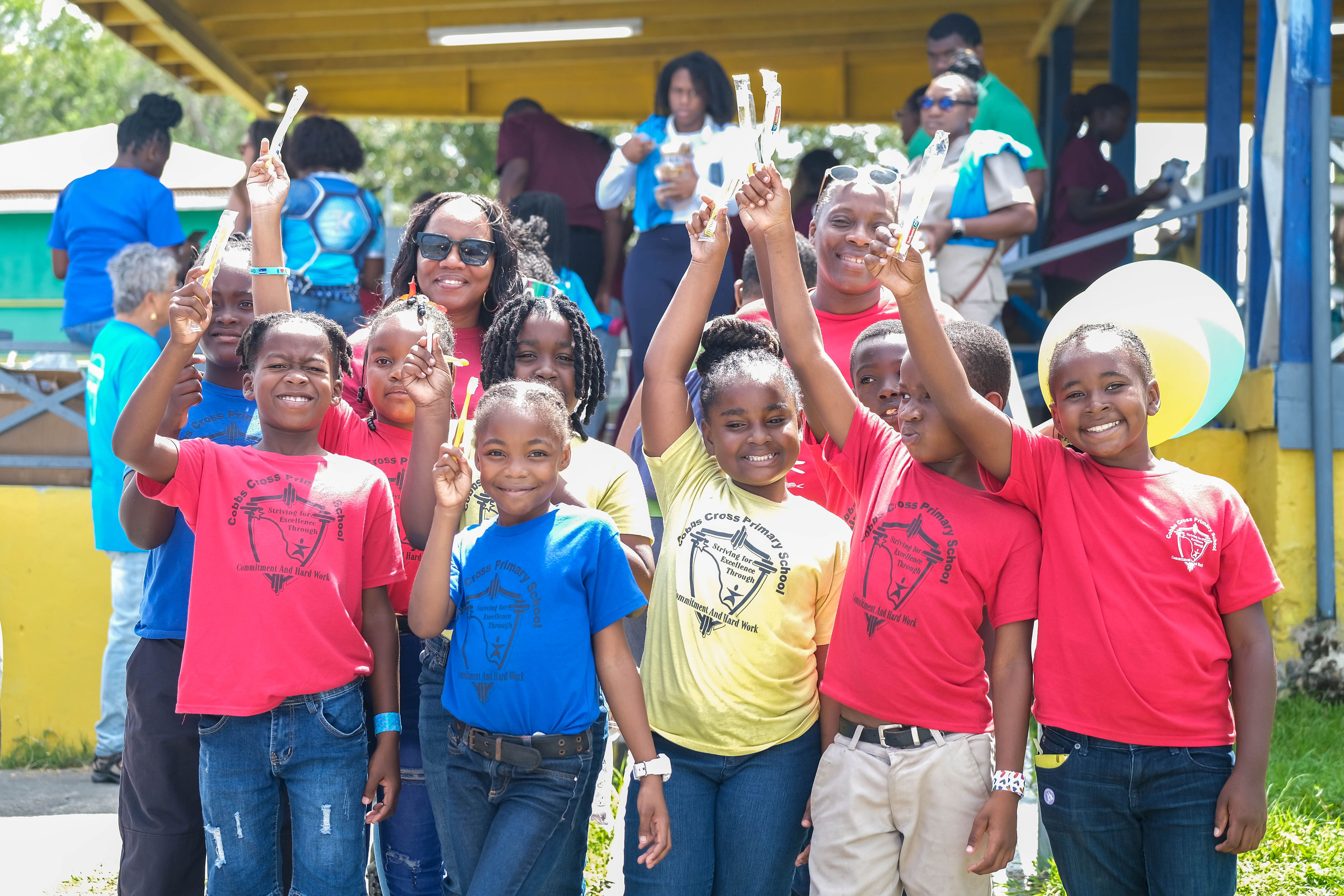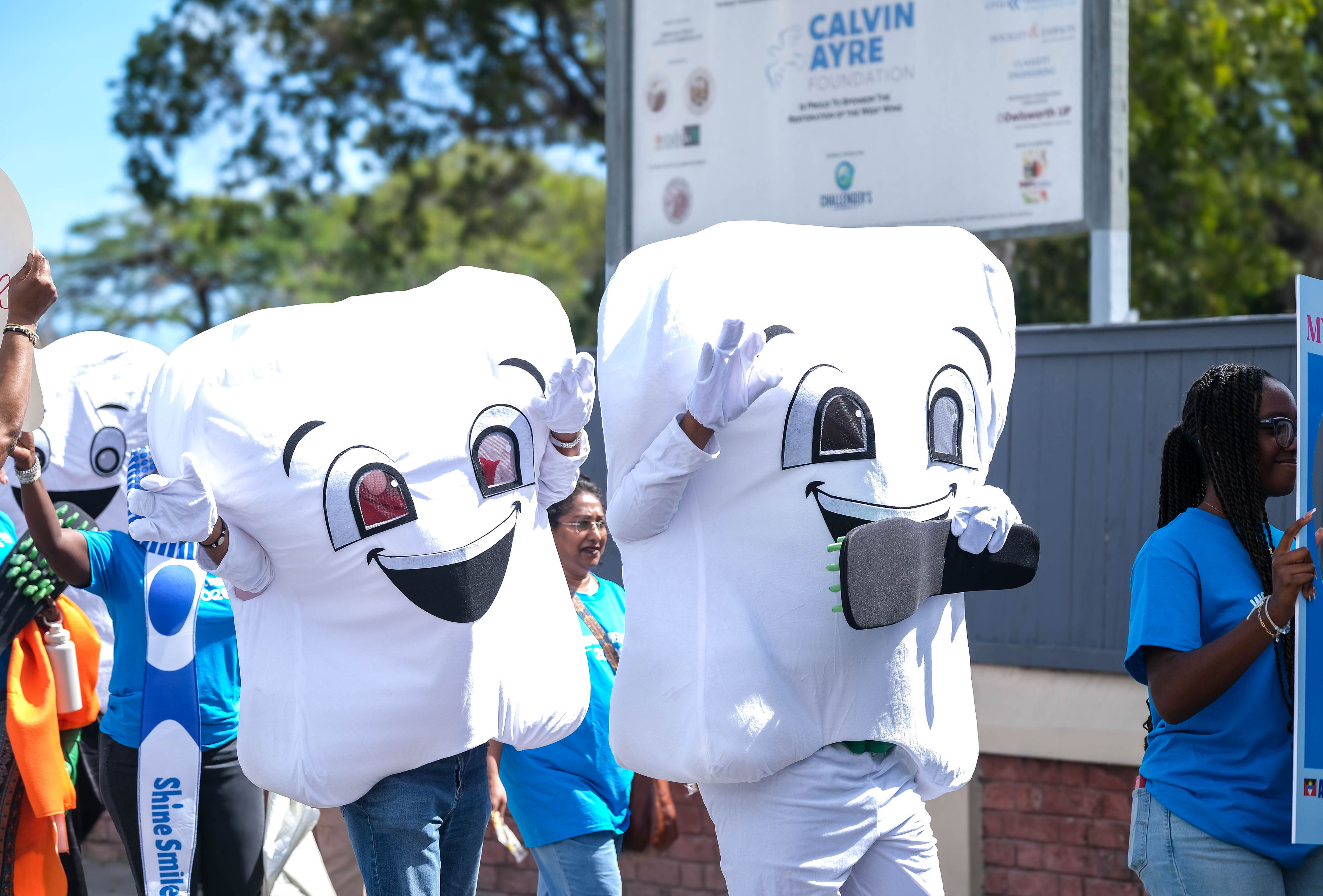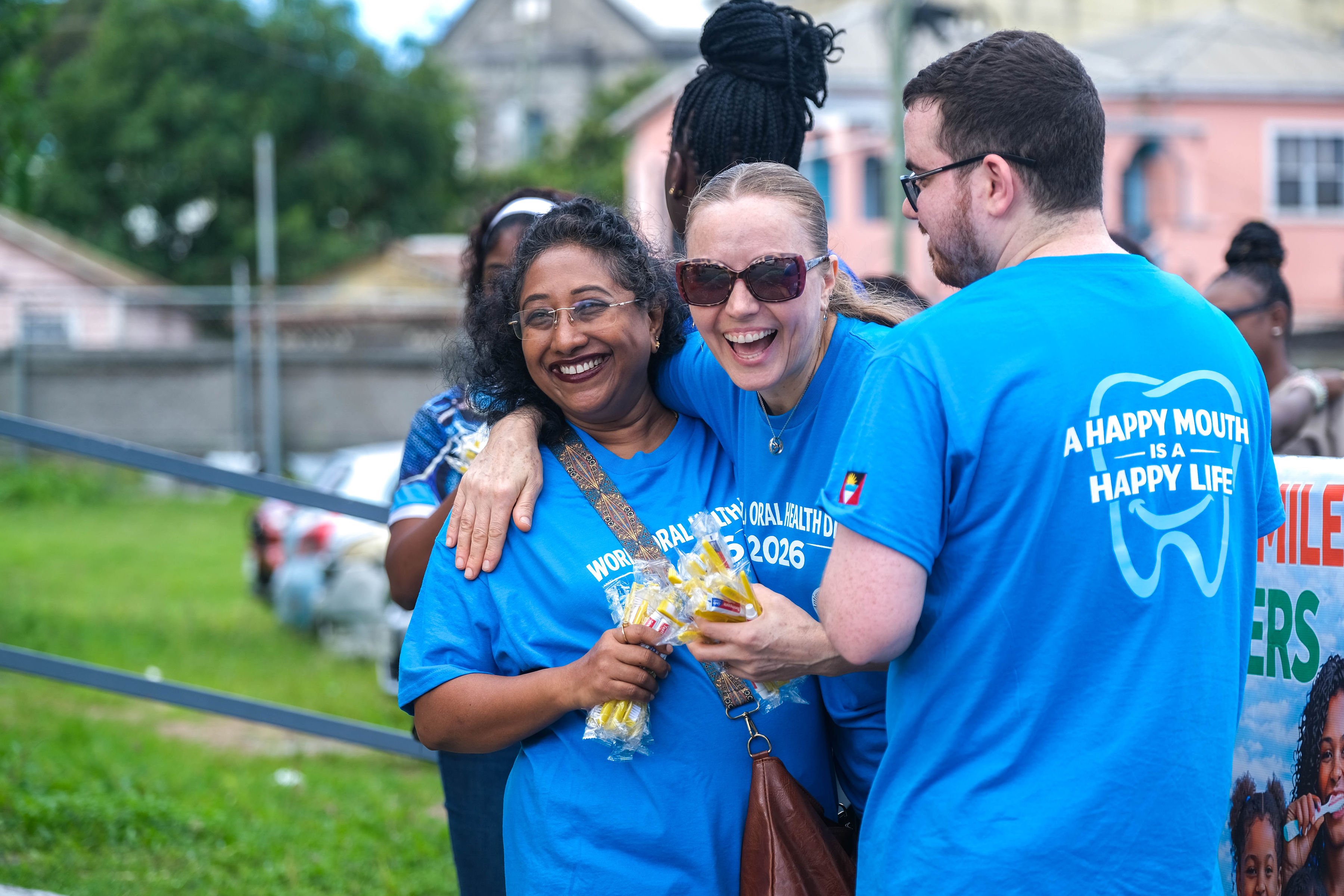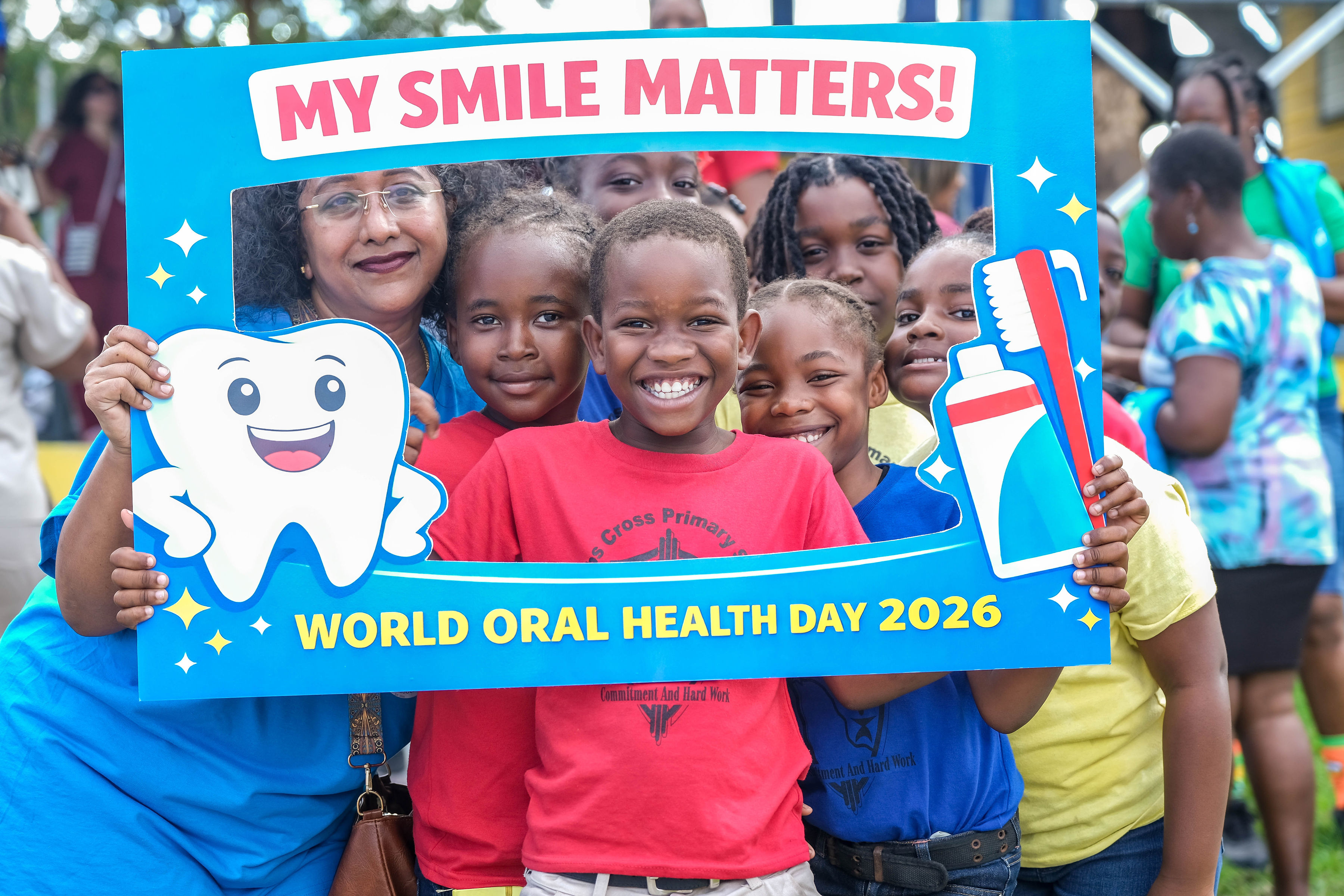Promotion began with radio advertisements featuring Toothie, the official FDI mascot, ending with our parade message and helping to build public anticipation and awareness. The parade opened with our police escort, followed by the Bon Appétit Drum Corps and bold 3 ft by 6 ft banners displaying the World Oral Health Day message and the logos of ABDA and FDI. The procession featured Toothie, fruits, vegetables, Mr. Toothpaste, and other costumed characters; 50 children from our Sunny Smiles schools accompanied by teachers; dentists walking and driving; and two decorated trucks carrying banners with messages such as “Your Smile Matters” and “Drink Water, Eat Fruits and Vegetables,” along with the 2026 slogan. Eighteen medical students from the University of Health Sciences Medical School participated, along with volunteers, first responders, and the Antigua and Barbuda Red Cross ambulance, one of our coalition partners. Participants wore blue World Oral Health Day T-shirts, while the costumes, music, movement, and color brought oral health and nutrition education to life. A main feature of the parade was also the photo frames taken with people who were lining the streets. They enjoyed having their pictures taken. Over 1,000 toothbrushes and toothpaste were given out along with 43 certificates for dental cleanings.
