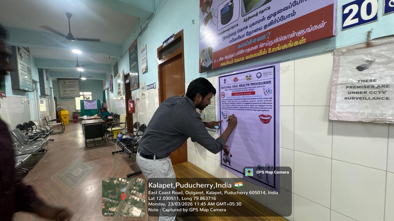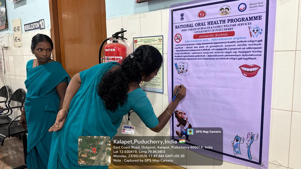 On 23.03.2026, in observance of World Oral Health Day, a signature campaign was conducted at PHC Kalapet to promote the theme “A Happy Mouth is a Happy Life.” The initiative aimed to raise awareness about the importance of maintaining good oral hygiene and its impact on overall health. Members of the public actively participated by signing the pledge, expressing their commitment to adopting healthy oral care practices. The campaign emphasized key messages such as regular brushing, balanced diet, and timely dental check-ups. Overall, the program served as an effective platform to encourage community involvement and promote long-term oral health awareness.