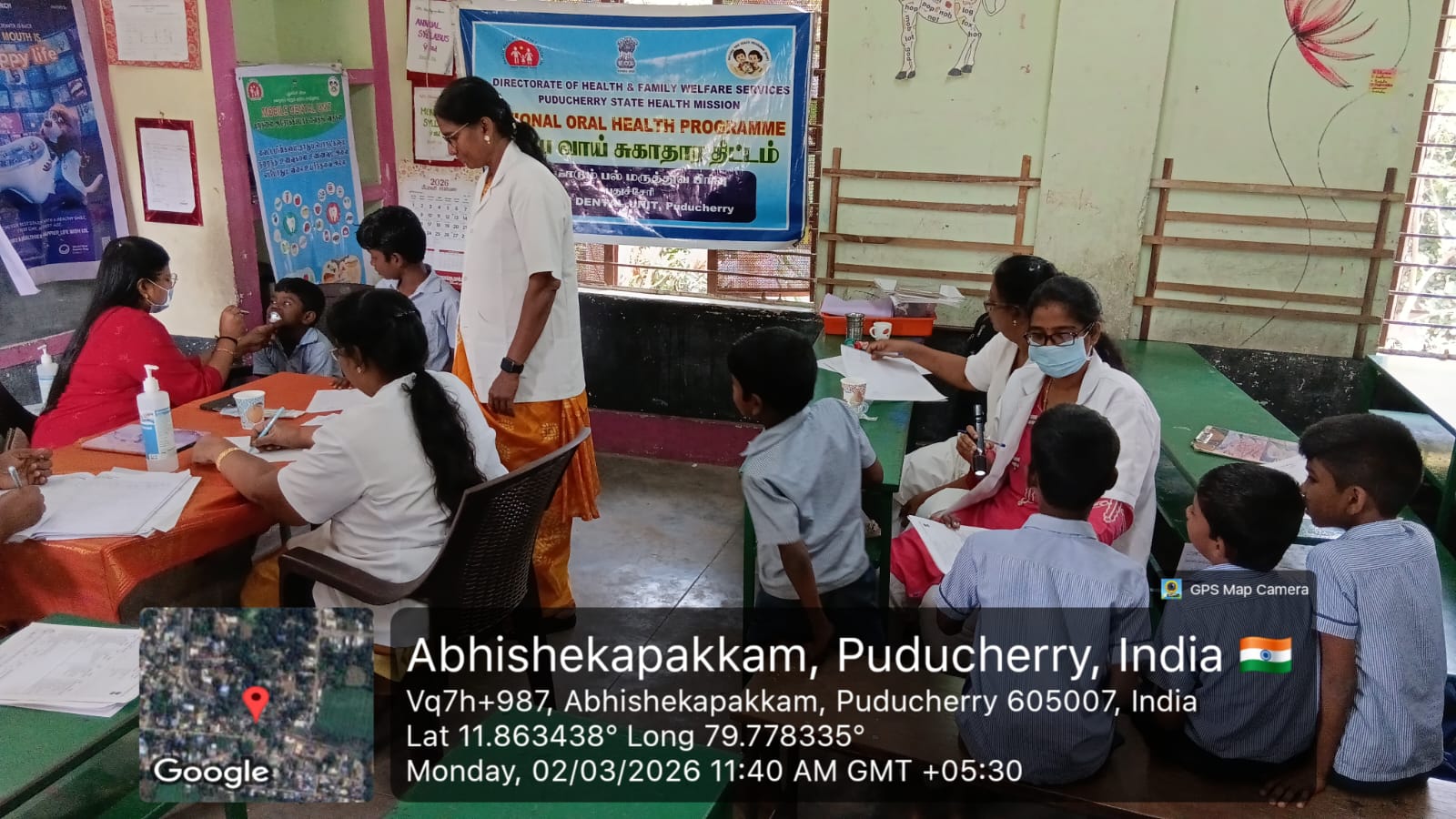 As part of the *World Oral Health Day 2026* celebrations, a _Drawing and colouring competition_ was conducted at *GPS Abhishekapakkam* on 02-03-2026. The event marked the beginning of the month-long activities with the theme *“Happy Mouth is a Happy Life.”* Children from Class 5 actively participated in the colouring competition, expressing their ideas on good oral hygiene practices. A special oral health awareness talk was also delivered to students and teachers, emphasizing proper brushing techniques, healthy eating habits, and the importance of regular dental check-ups. Around *72* students got benefitted from screening. The program was interactive and informative, benefiting nearly *121* participants.