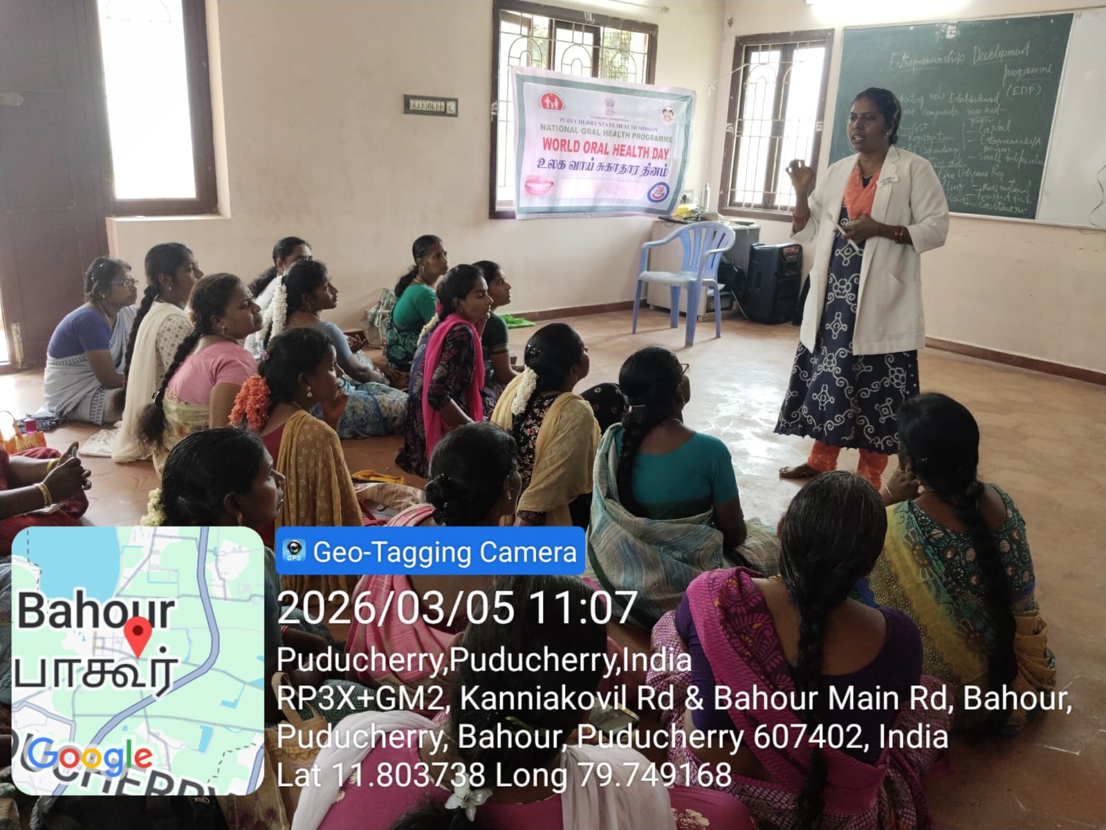 AAM Bahour At Green skill development program created an awareness about oral health among enterpreneur. The program aimed to create awareness about the importance of maintaining good oral hygiene and preventing dental diseases. Brushing techniques were demonstrated using dental models to educate participants on proper oral care practices. Informative posters highlighting common dental problems and preventive measures were displayed for better understanding. The theme Happy Mouth is a Happy Life was clearly explained, emphasizing the connection between oral health nearly 50 benefited by this interactive session