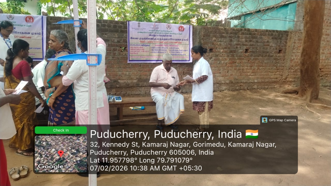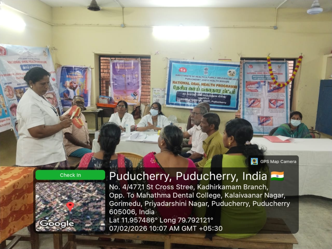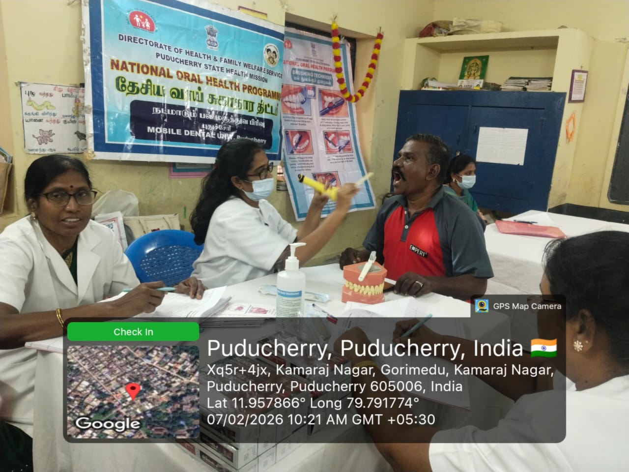 An *Oral Screening* and *Oral Awareness* Camp was successfully organized at *GPS Kamaraj Nagar* , under *PHC Gorimedu* , in collaboration with the *Pondicherry AIDS Control Society (PACS)* and *National AIDS Control Organization (NACO).* The event formed part of an *Integrated Health Camp* held on February 7, 2026.