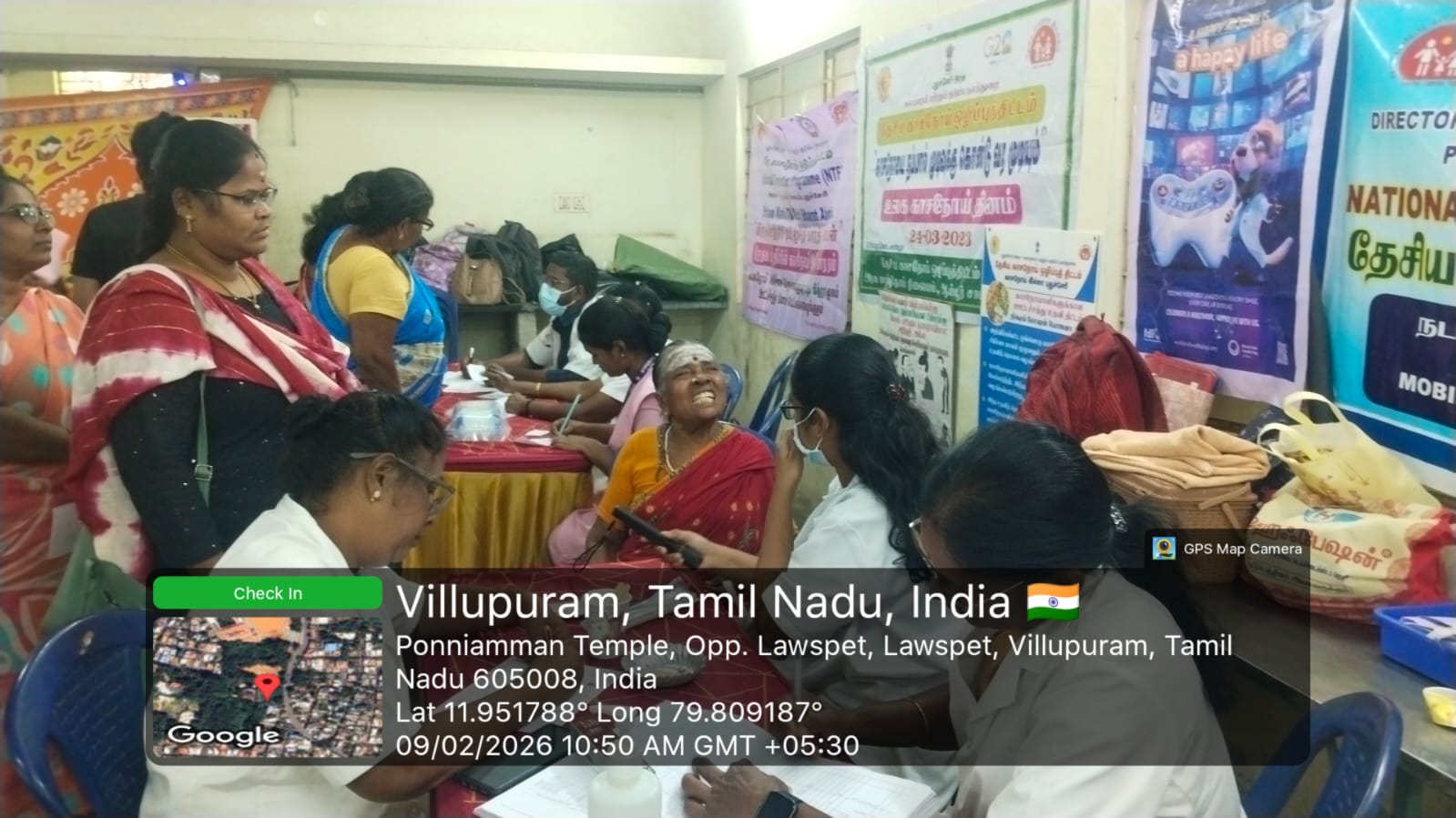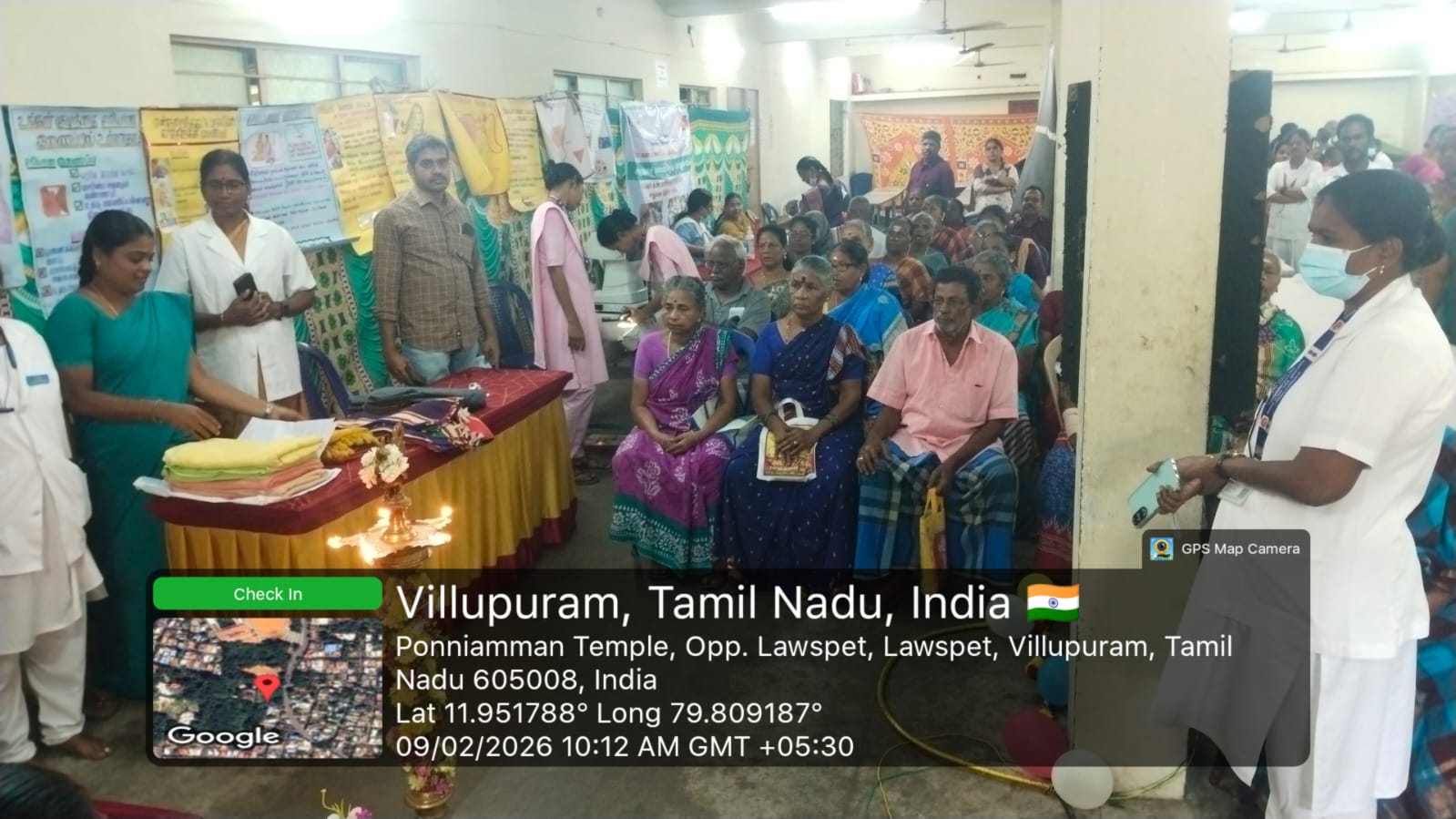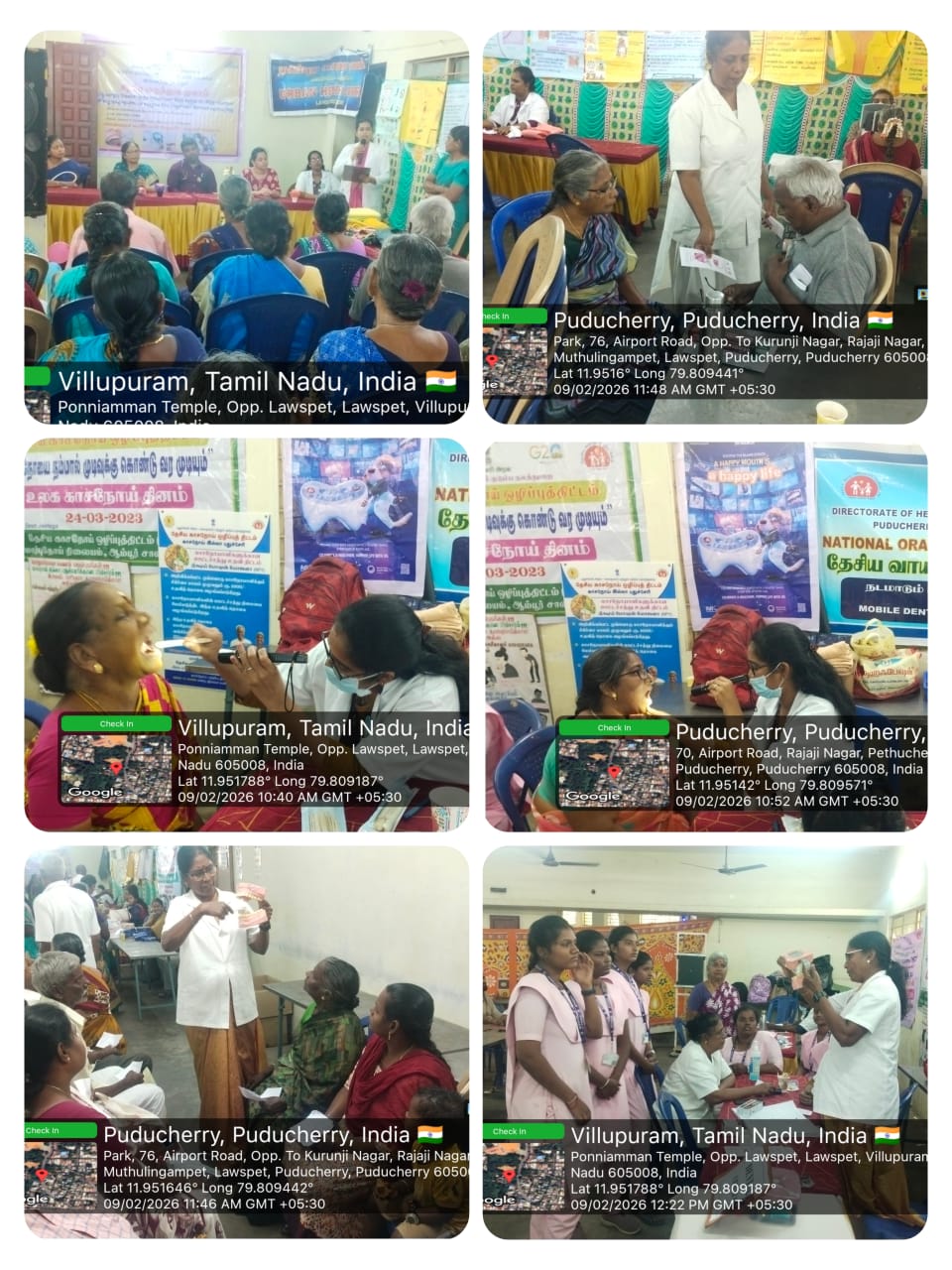 "An Oral Screening and Awareness services were conducted as part of the *Mega Special Health Camp* held at *Ponniamman Koil, Lawspet* by *UPHC Avvai nagar* on 9-2-2026. The camp provided comprehensive health services including dental check-up, blood pressure screening, hypertension evaluation, ENT examination, eye check-up, and general physician consultation. Specialists from various departments actively participated to ensure complete healthcare support for the public.