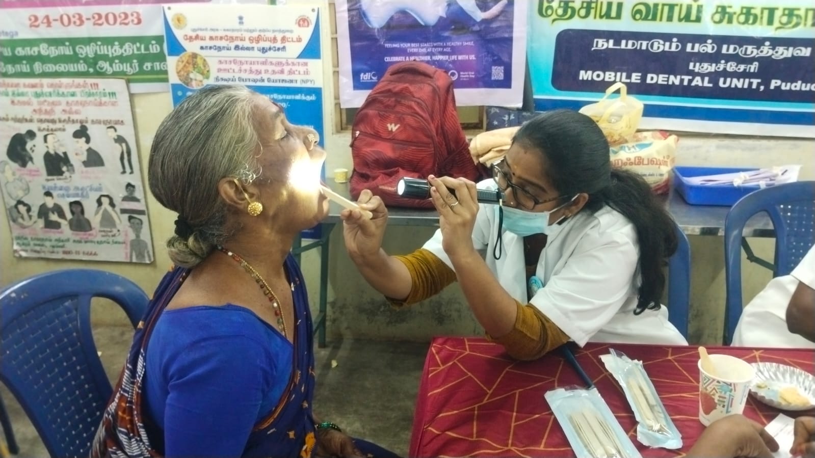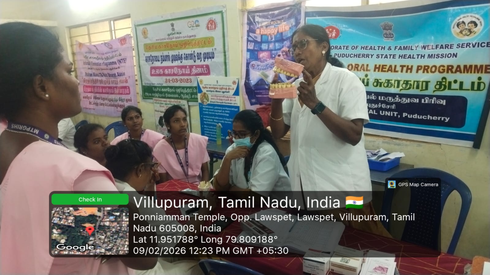 The camp was inaugurated by *Dr. Shamimmunisha,(Deputy Director of Public Health.)* and Dr. Meenu ( MO- Incharge of Avvai Nagar ).Oral cancer screening was carried out for the general public to promote early detection and prevention. Anti-tobacco awareness and dental health orientation sessions were conducted for the general public as well as nursing students of *Mother Theresa Nursing College* to educate them about the harmful effects of tobacco and the importance of maintaining oral hygiene.