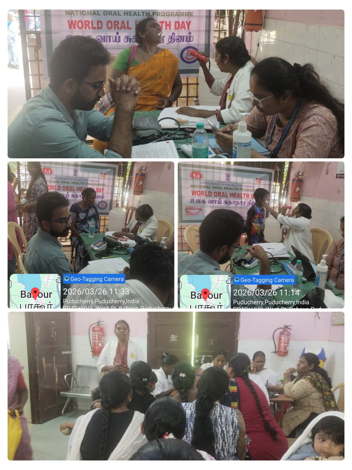 26.03.26 PHC Bahour, Oral Screening Camp ,WOHD 2026World Oral Health Day celebration dental awareness session was conducted for the well baby clinic mothers and general public. The theme “ Happy Mouth is a Happy Life" was explained, highlighting the importance of maintaining good oral hygiene, early detection of dental problems, and promoting oral health awareness among the community participated and gained useful knowledge. On account of World Oral Health Day the theme " A happy mouth is a happy life"& Oral health pamplets distributed.