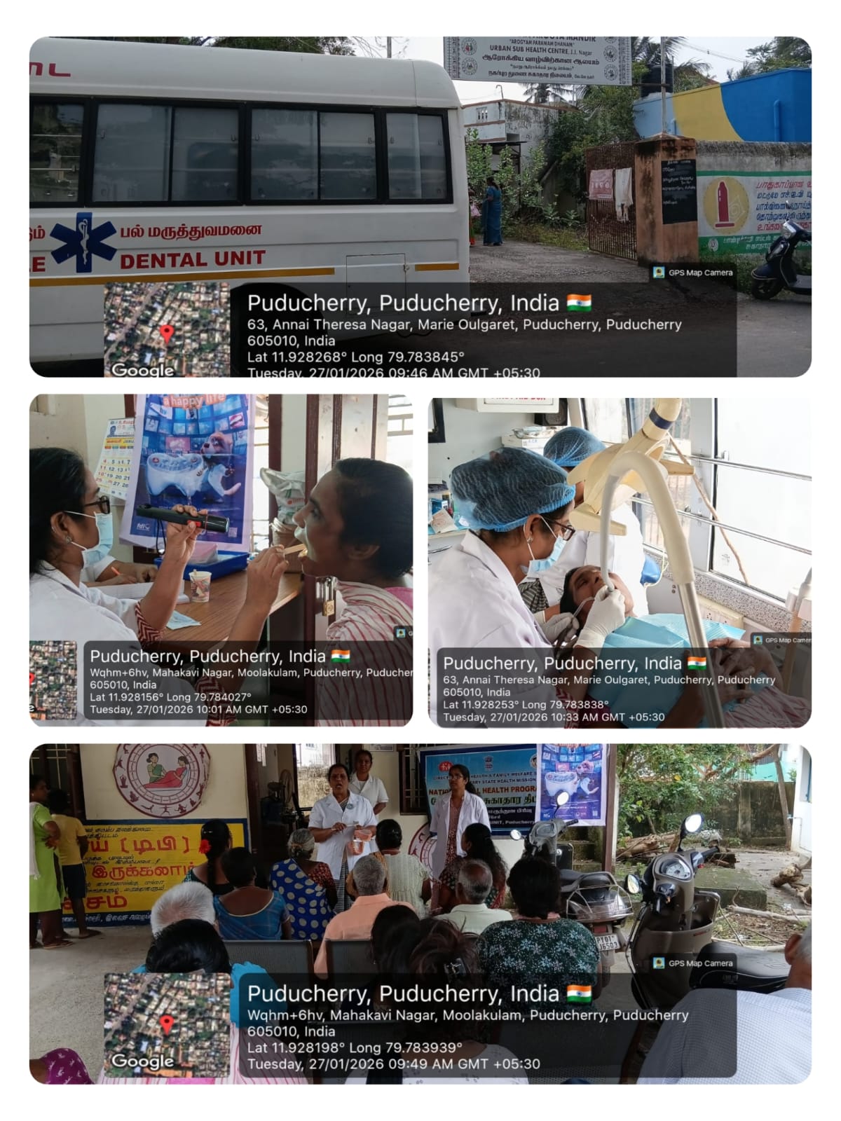 An Oral Screening and trearment camp was conducted at Urban Sub Health Centre , JJ Nagar, Moolakkulam, on 27-01-2026 to promote community oral health. The program included general oral screening and dental check-ups for the public. Awareness on oral hygiene and dental care was provided using dental models and banners.Brushing techniques demonstrations to help participants understand proper brushing techniques and preventive practices. A tobacco awareness talk was also delivered to educate the public on the harmful effects of tobacco on oral health. In addition, special oral hygiene instructions were given to mothers attending the _well-baby_ clinic, emphasizing early dental care for children. Overall, the camp was beneficial, with nearly *53* participants receiving guidance and screening services.