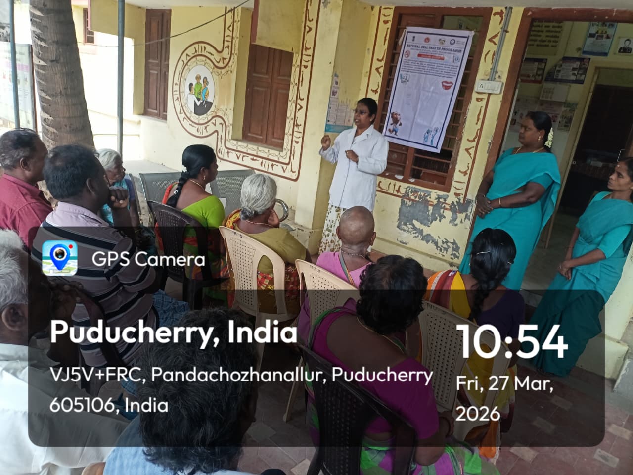 27/3/26 Dental unit- PHC Nettapakkam # WOHD 26 Celebration @ SUBCENTRE PANDASOZHANALLU.The NCD patients were given awareness on Oral Health and its relationship to overall wellness. Do's and don'ts in oral care were explained. Brushing techniques were demonstrated using dental models and posters. Ill effects of Tobacco and its vulnerability among adolescents were highlighted. Role of TCC services and NRT gums availability at the facility were stressed upon. Oral hygiene pledge was taken. Oral screening was done and referred to dental OPD, PHC Nettapakkam for dental management. Oral health and insights of Tobacco pamphlets were distributed for good oral hygiene practices and healthy living.Beneficiaries: 17