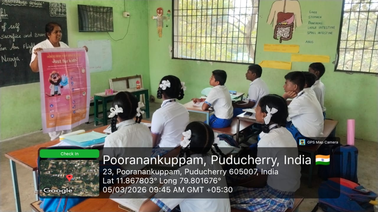 On *5/3/2026* , a *World Oral Health Day celebration* was conducted at *Sanfort International School* , Pooranankuppam. As part of the program and in connection with *Women’s Day celebrations,* an oral health awareness session was conducted for the students. The importance of maintaining good oral hygiene and regular dental check-ups was explained in an interactive manner. Proper brushing techniques were demonstrated to encourage healthy habits among children through _Toothie_ fact sheet and models. In addition, a _colouring_ competition based on the theme of *A Happy Mouth...Is A Happy Life* was organized to promote creativity and awareness among the students. The activity helped students understand the importance of keeping their mouth healthy. Nearly *250* students benefited from the program.