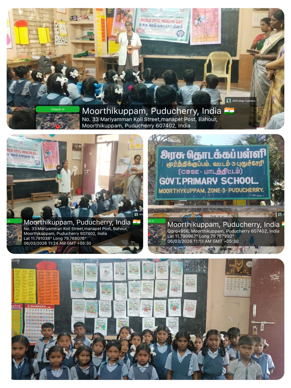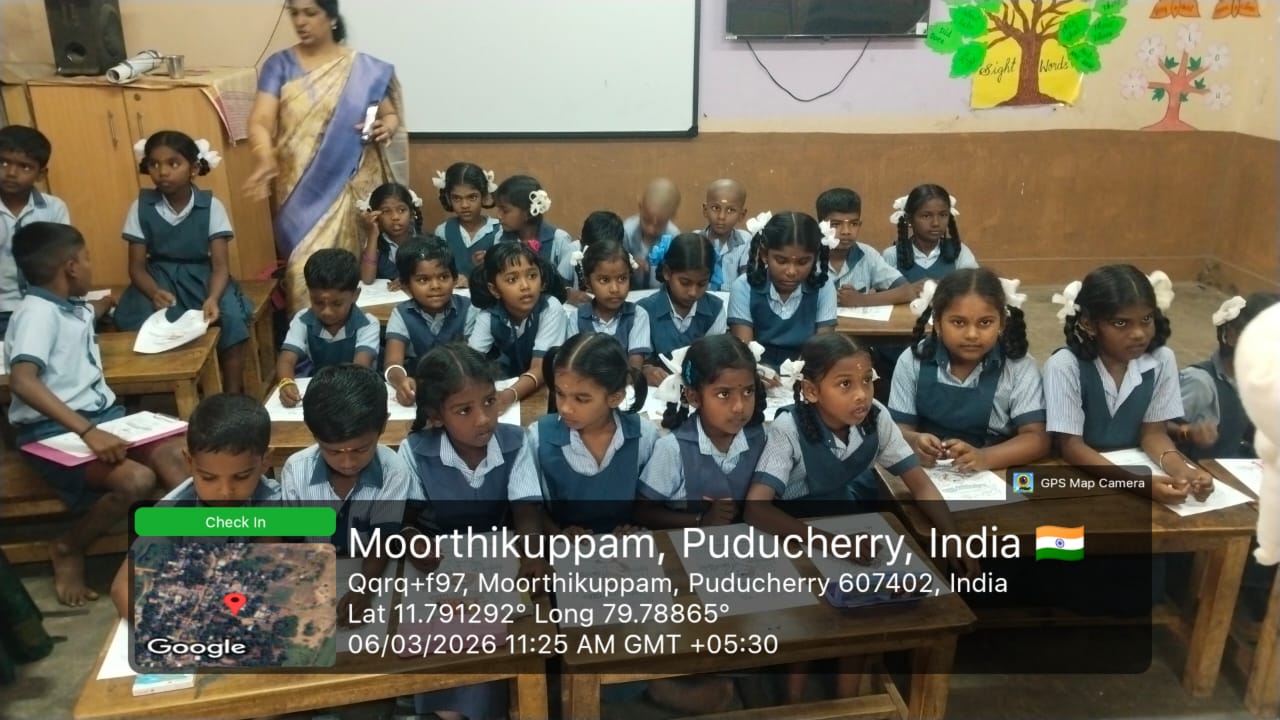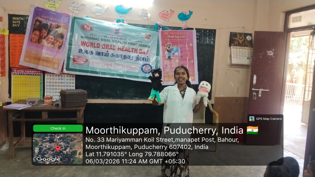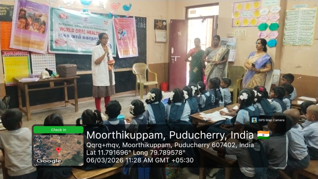As part of the World Oral Health Day celebration, a coloring competition was conducted at *GPS Moorthikuppam* for the students of 4th and 5th standard on 6/3/26.. The activity was organized to create awareness about oral health among school children. The theme “ *Happy Mouth is a Happy Life”* was explained, and students enthusiastically participated in the *Toothie* doll coloring competition. Through this creative activity, children learned the importance of maintaining good oral hygiene and caring for their teeth from an early age. The competition encouraged students to express their ideas about healthy smiles through art. Nearly *63* students benefited from this program.