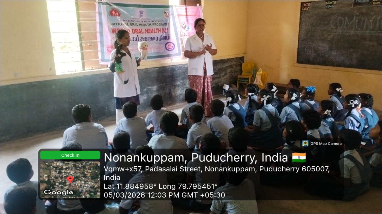 WOHD celebration :An oral health awareness session was conducted for the primary school students of *GPS Nonankuppam* on 5-3-2026. The session focused on educating children about the importance of maintaining healthy teeth and good oral hygiene habits. Students were encouraged to brush regularly and take care of their teeth to prevent dental problems. Nearly *84* students benefited from the session.