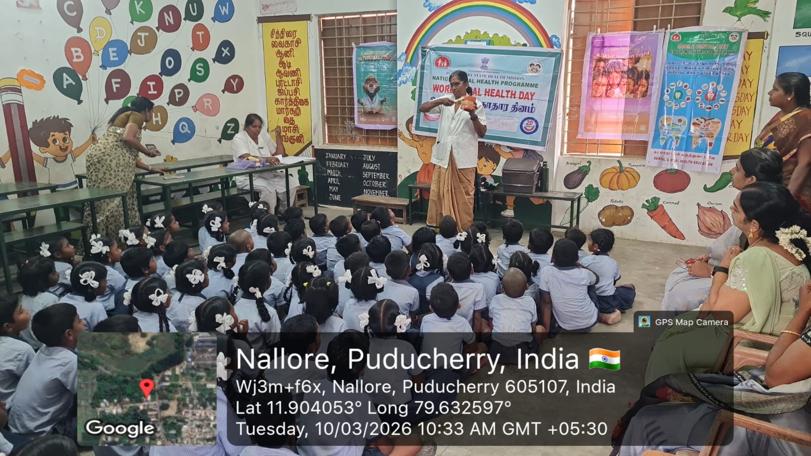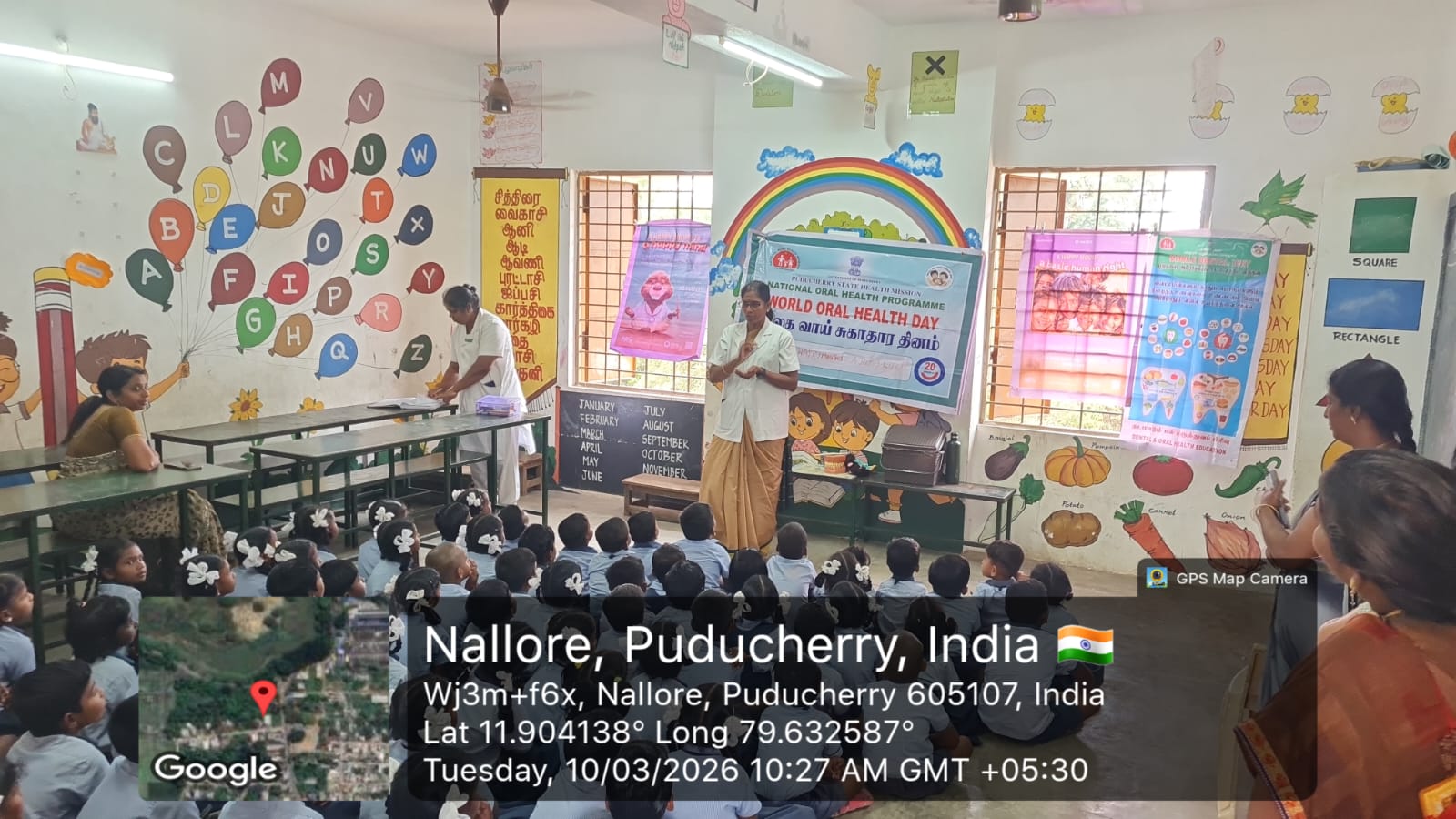 WOHD Celebration: An oral health awareness talk was conducted for the students of *Government Primary School, Nallore* on 10.03.2026. The session focused on the importance of maintaining good oral hygiene to prevent common dental problems such as tooth decay and gum diseases. Proper brushing techniques were demonstrated using a brushing model to help students understand the correct method of cleaning their teeth. The importance of brushing twice daily, reducing sugary food intake, and visiting the dentist regularly was also explained. Students actively participated and clarified their doubts during the session. The program was informative and beneficial, and nearly *85* students benefited from this awareness activity.