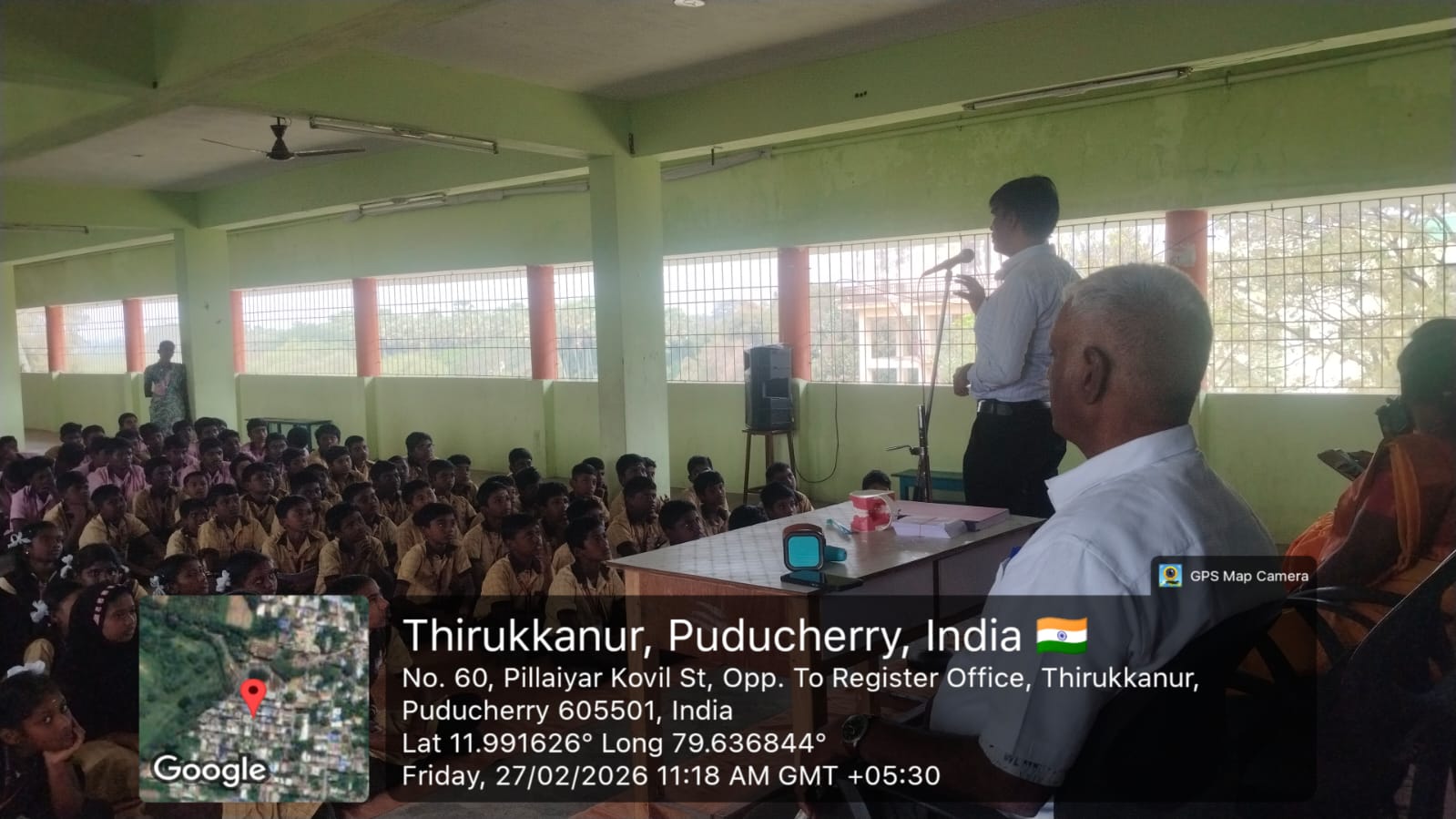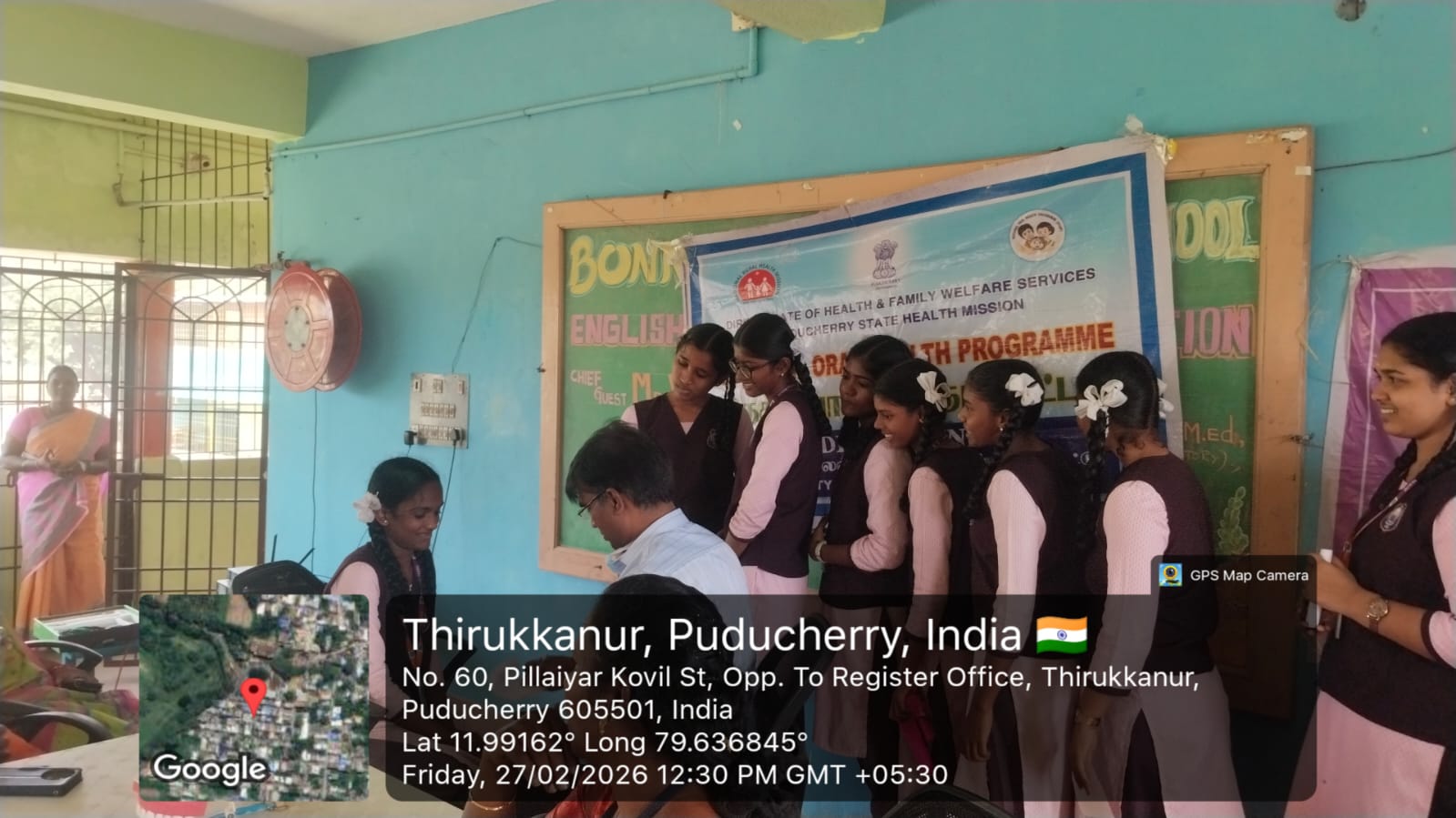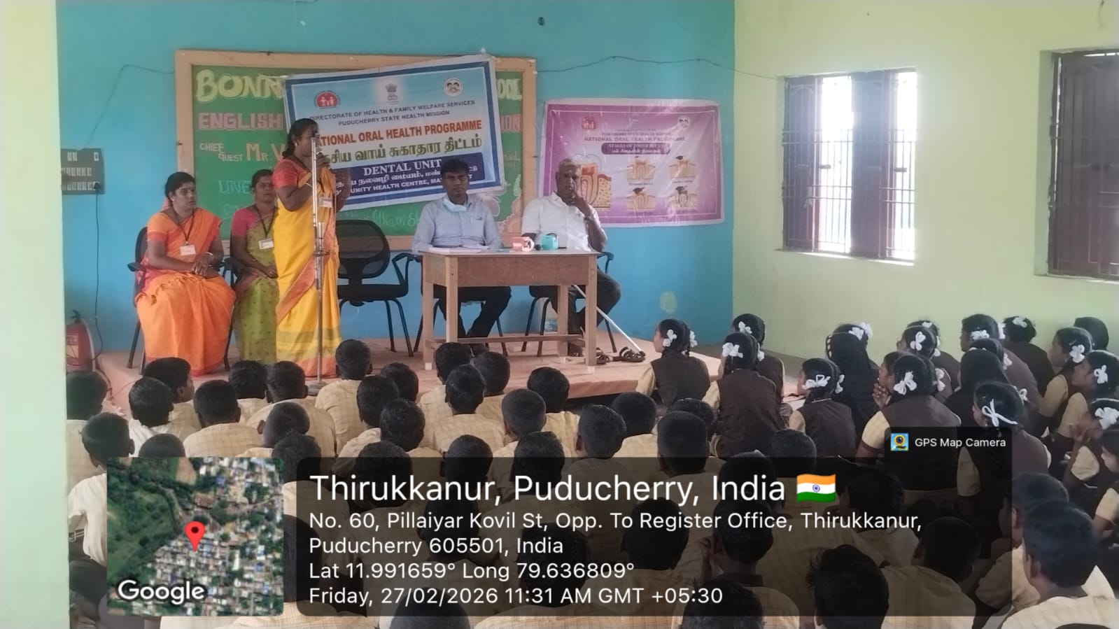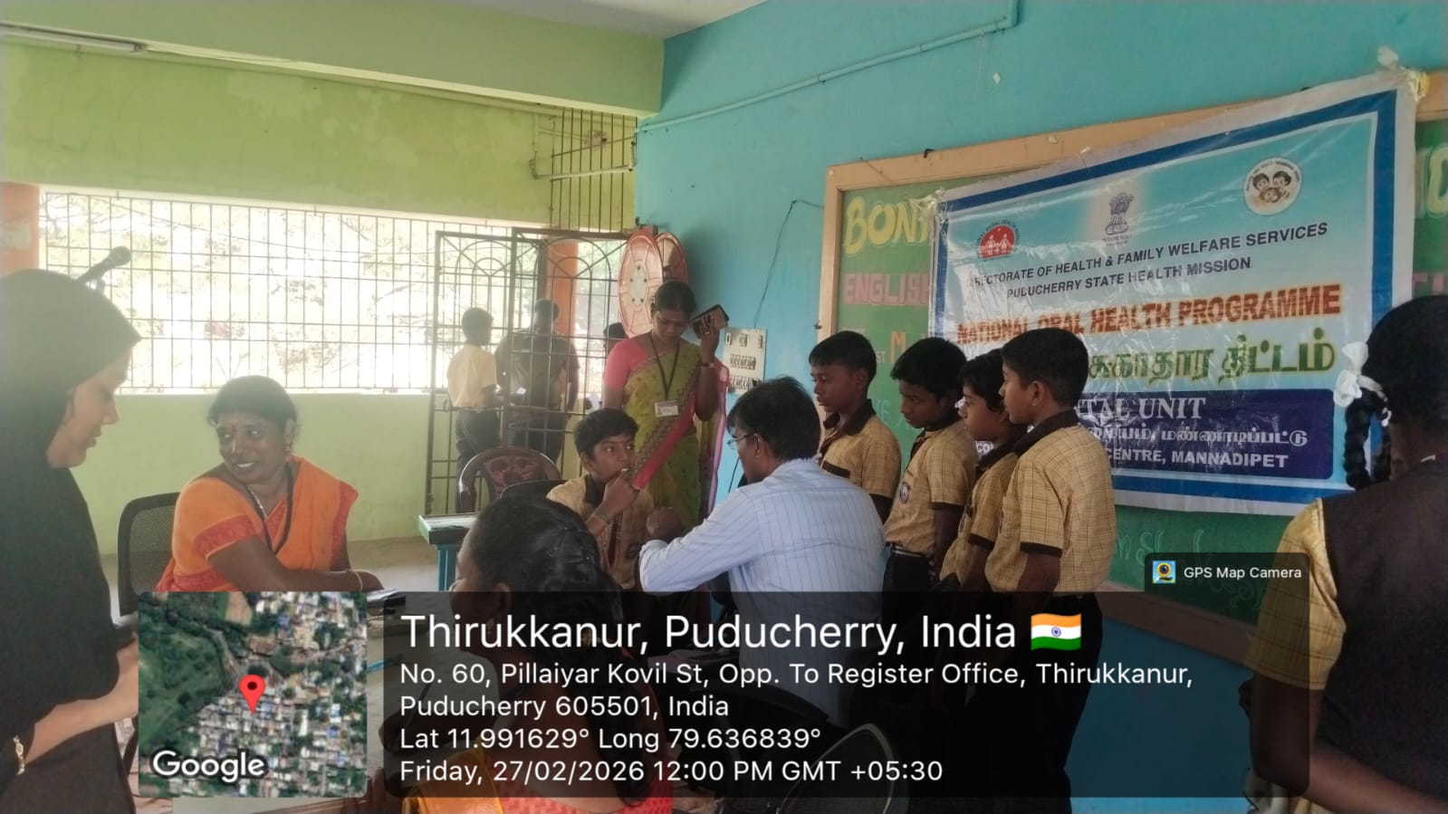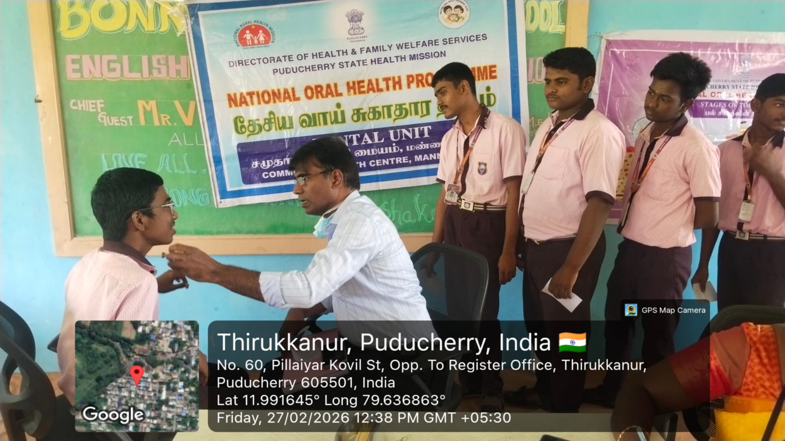 "27/2/26. CHC Mannadipet An oral screening camp conducted at Bonne Nehru Higher Secondary School Thirukanur .°During the camp, dental check-ups were carried out to identify common oral health problems such as dental caries, gum diseases, and oral lesions.