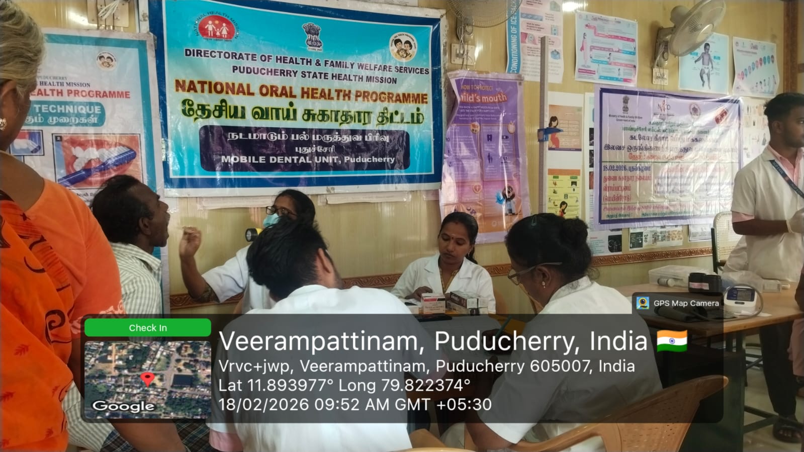 An oral screening camp was conducted at *Periyaveerampattinam* on 18-02-2026 as part of the _Seashore Integrated Health Camp_ organized by *Pondicherry AIDS Society Organization.* The camp aimed to improve oral health awareness and provide early screening services to the coastal community. Informative fact sheets were displayed to educate the public about the harmful effects of tobacco use and the importance of maintaining good oral hygiene.