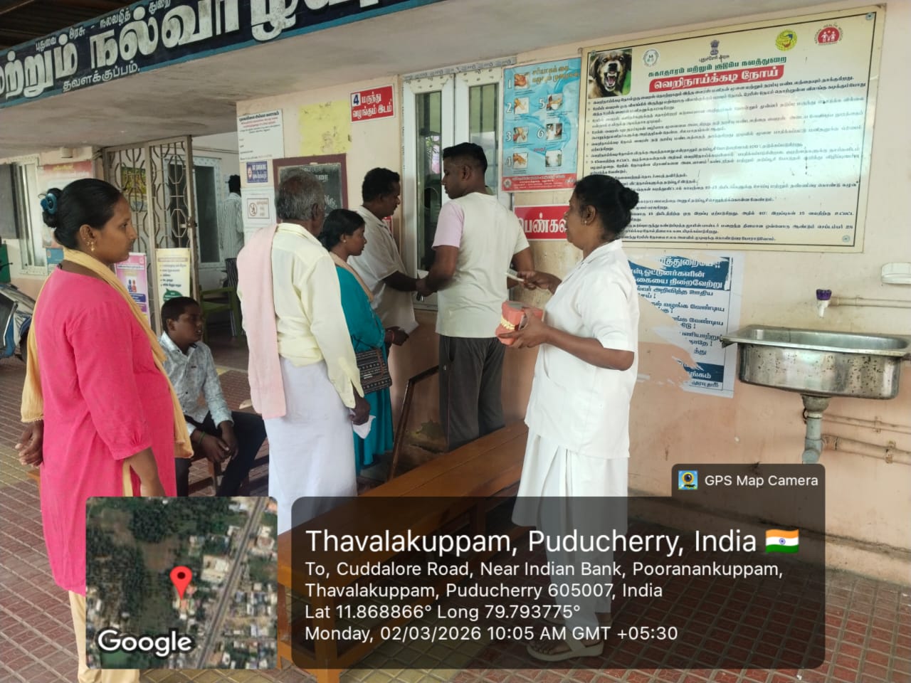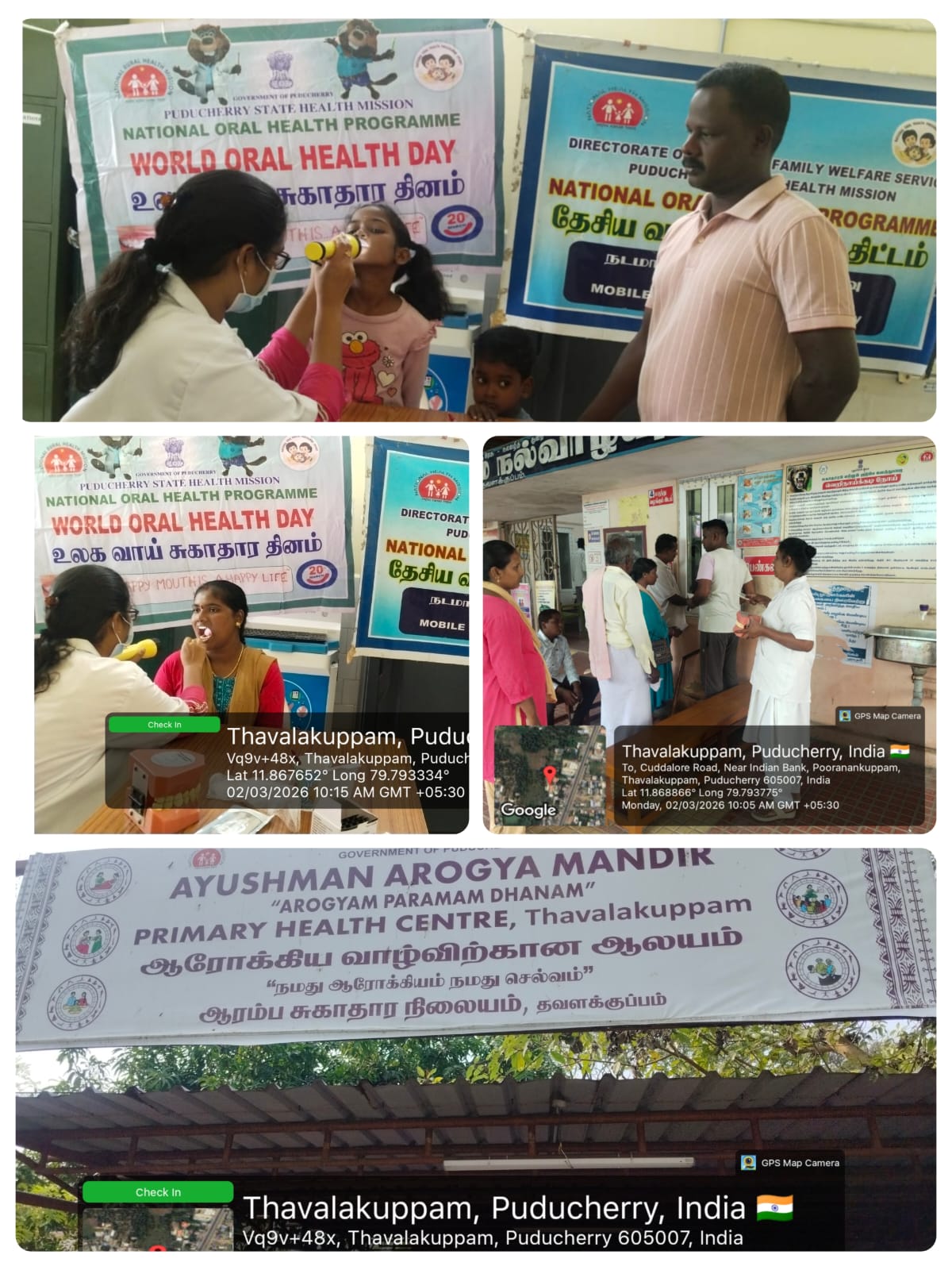 On behalf of **World Oral Health Day Celebration* _2026_ ,* an oral screening camp was conducted at *AAM PHC Thavalakuppam* for the general public. The program aimed to create awareness about the importance of maintaining good oral hygiene and preventing dental diseases. Brushing techniques were demonstrated using dental models to educate participants on proper oral care practices. Informative posters highlighting common dental problems and preventive measures were displayed for better understanding. The theme “ *Happy Mouth is a Happy Life”* was clearly explained, emphasizing the connection between oral health and overall well-being. Nearly *25* beneficiaries attended the camp and benefited from the screening and awareness session.
