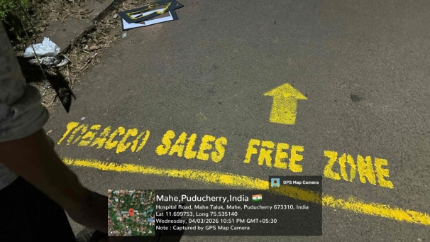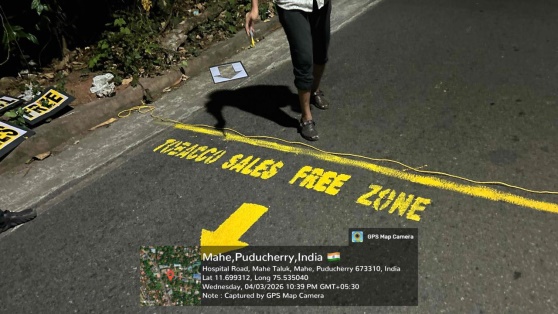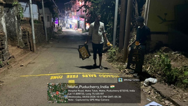 Demarcation lines of Tobacco Sales Free Zone along with correction of controversial old lines in Mahe region was carried out at Midnight by Mr Adarsh P Epidemiologist, Mr Abhishek Dialysis Tech and Dr Satish B DNO NTCP & NOHP at midnight of 4th March 2026