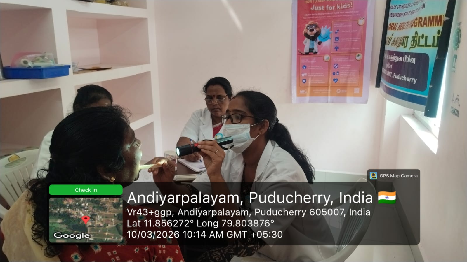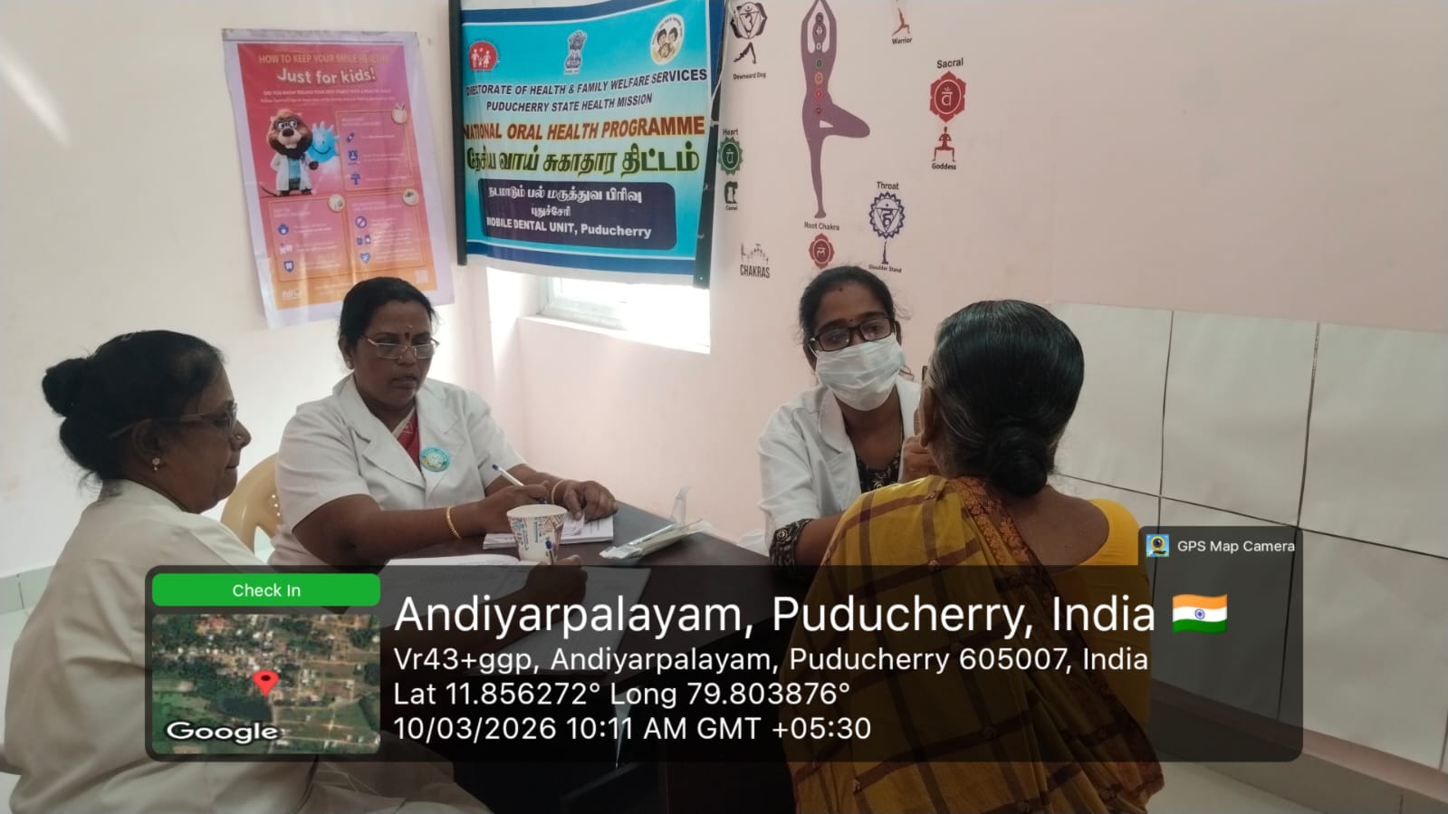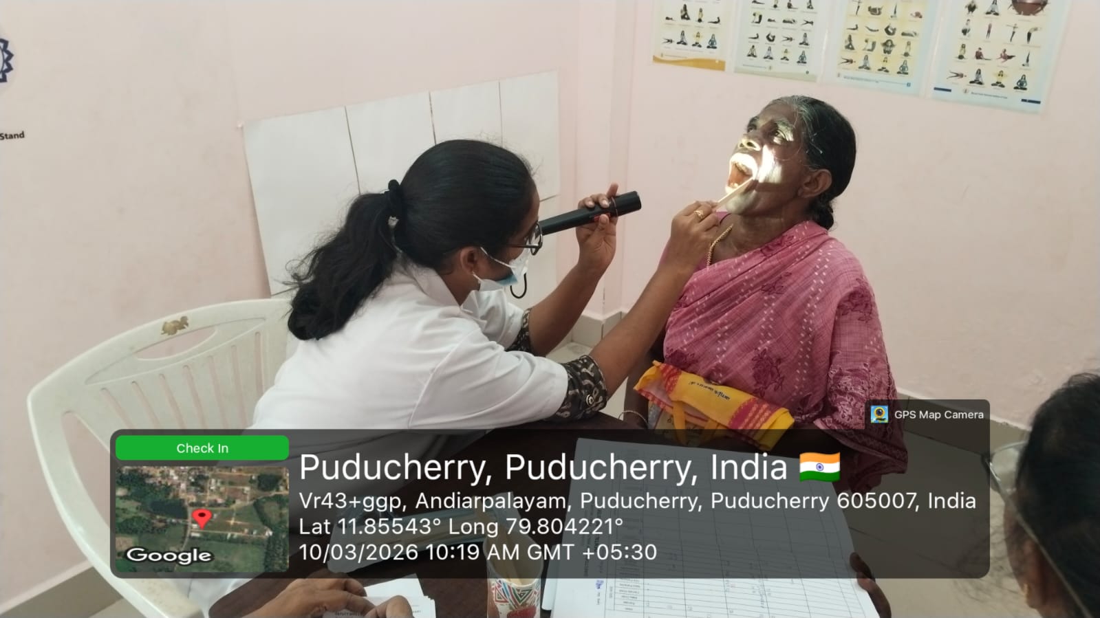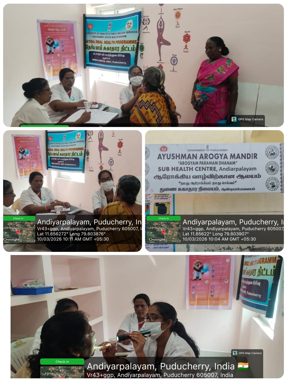 As part of the *World Oral Health Day celebration,* an oral screening camp was conducted at *AAM- SHC - Andiarpalayum* on 10/3/26 for *NCD* patients. The program focused on promoting good oral hygiene and the importance of maintaining a healthy mouth for overall well-being. During the camp, oral examinations were carried out to identify common dental problems and patients were advised about appropriate treatment and preventive care. Tobacco awareness was also provided, highlighting the harmful effects of tobacco on oral and general health. Brushing techniques and basic oral hygiene practices were demonstrated to the participants. Informative guidance on maintaining proper oral health was given to the general public. Nearly *61* beneficiaries attended and benefited from the screening and awareness session.